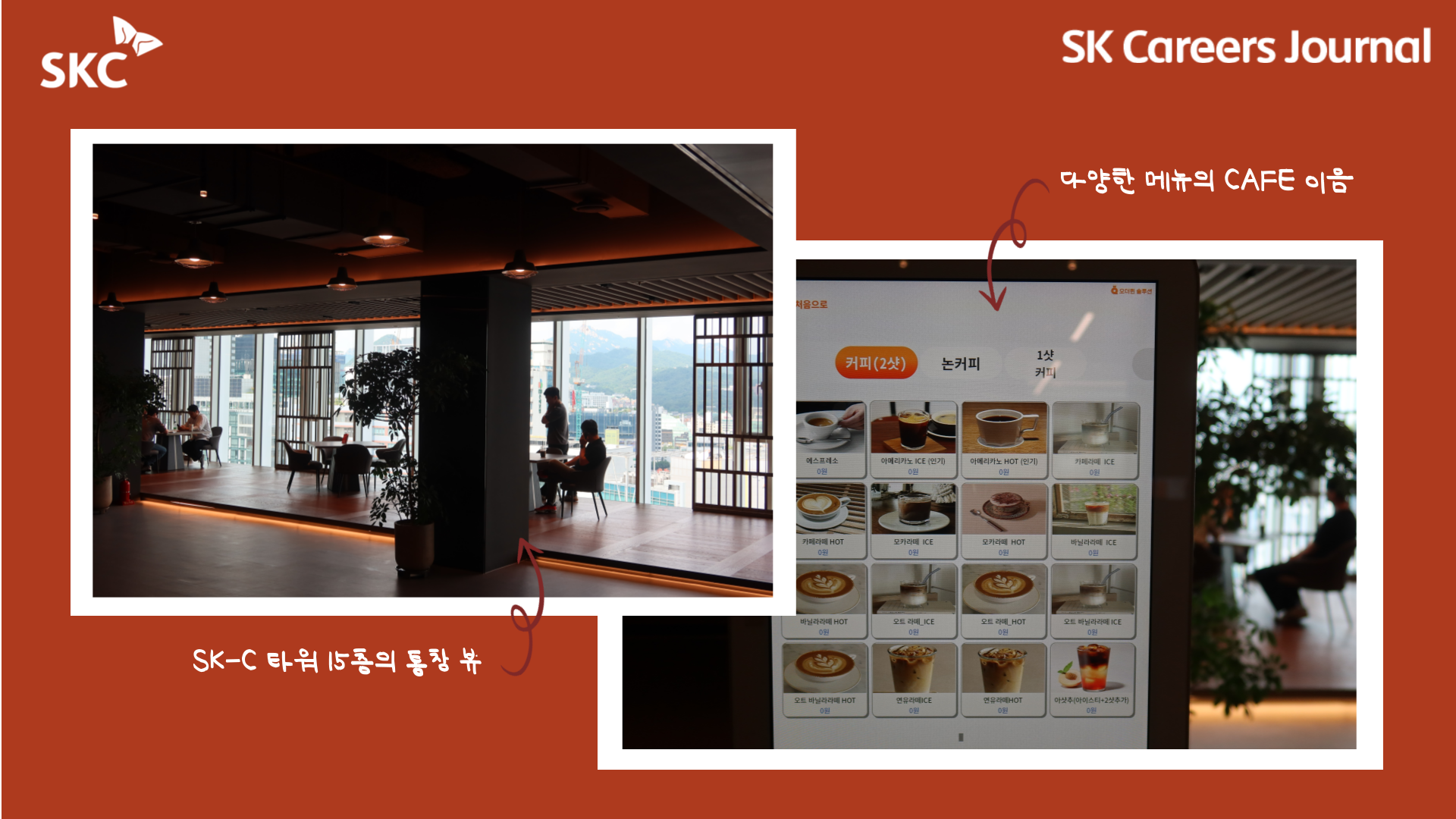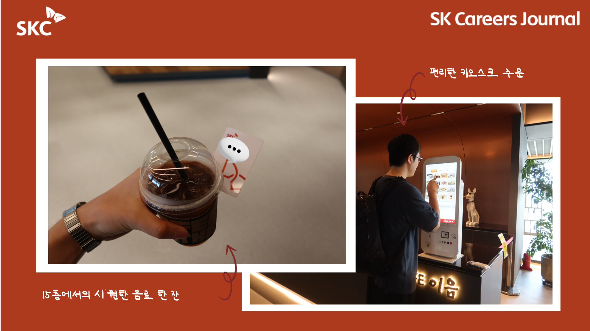 저도 이번 사옥 탐방을 하며 ‘CAFÉ 이음’에서 음료를 한잔 마실 수 있었는데요, 프랜차이즈 커피 전문점만큼 맛있는 음료와 넉넉한 양에 놀라고, SKC 구성원은 매일 무료로 마실 수 있다는 점에 한번 더 놀랐답니다. 👍