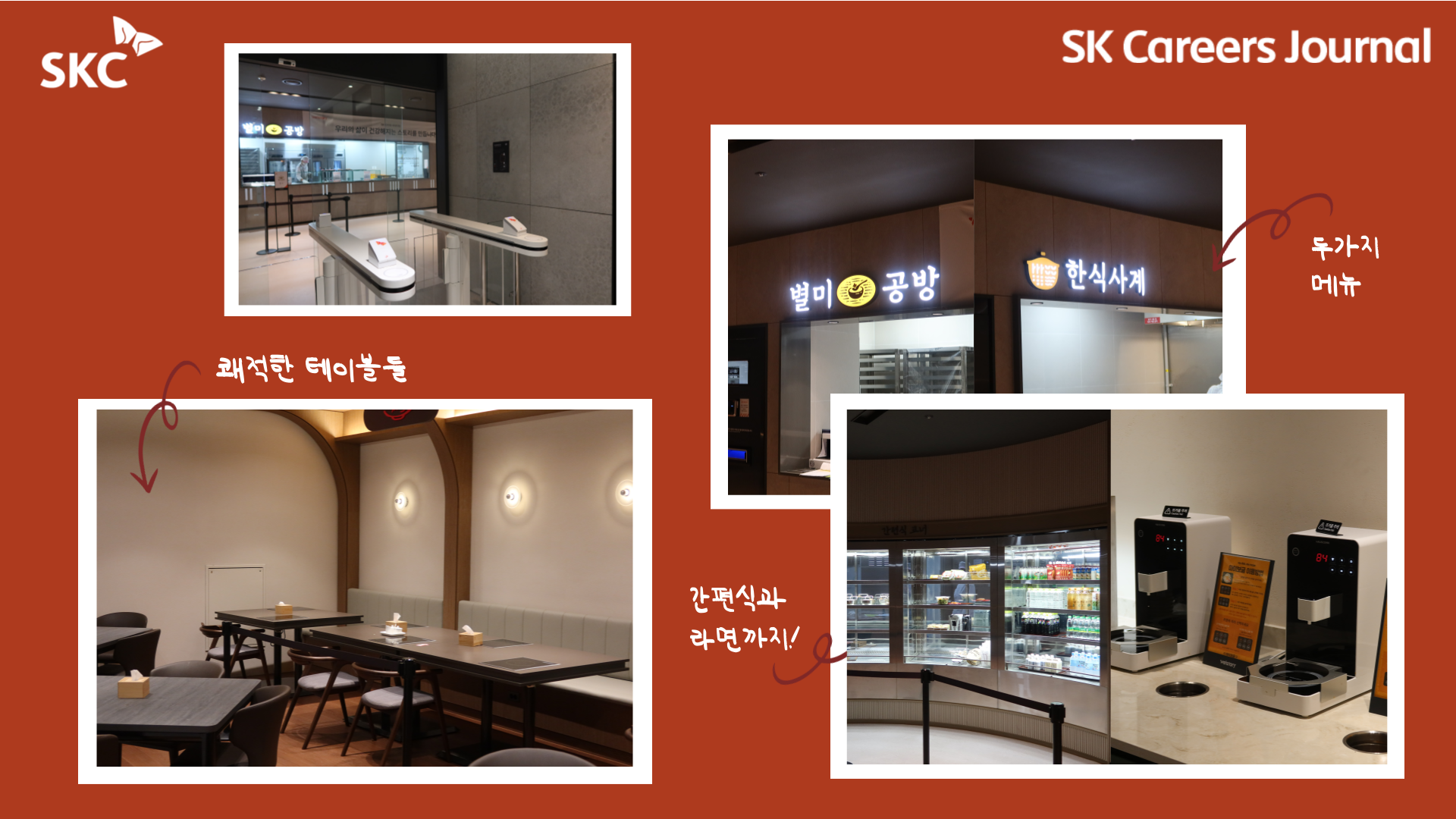 이 사내식당은 SKC 구성원의 선택을 받아 만들어졌는데요, 구성원들이 직접 설명회를 듣고 시식해보며 업체를 선정했다고 합니다. 사소한 부분에서도 수평적이고 참여형 문화가 돋보이지 않나요?