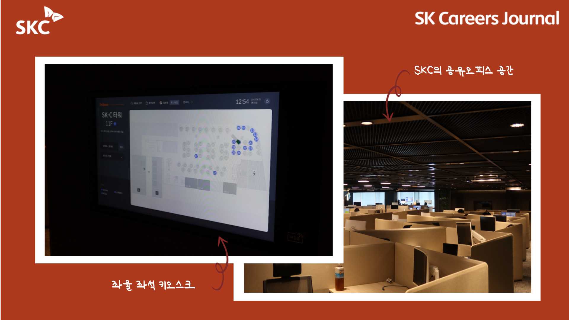 출근을 하게 되면, 사원증을 찍고, 키오스크를 활용해 당일 사용할 좌석을 예약해 사용하면 된답니다. 자리에는 모니터와 케이블 등 필요한 시설🖥️만 있어 그 외의 공간은 나의 취향과 업무 스타일에 맞게 간단하게 꾸미고 하루를 보낼 수 있습니다. 끊임없이 혁신을 향해 변화하고 앞으로 나아가려는 SKC의 정신, 업무 공간에서도 새삼 느껴지는군요. 👍