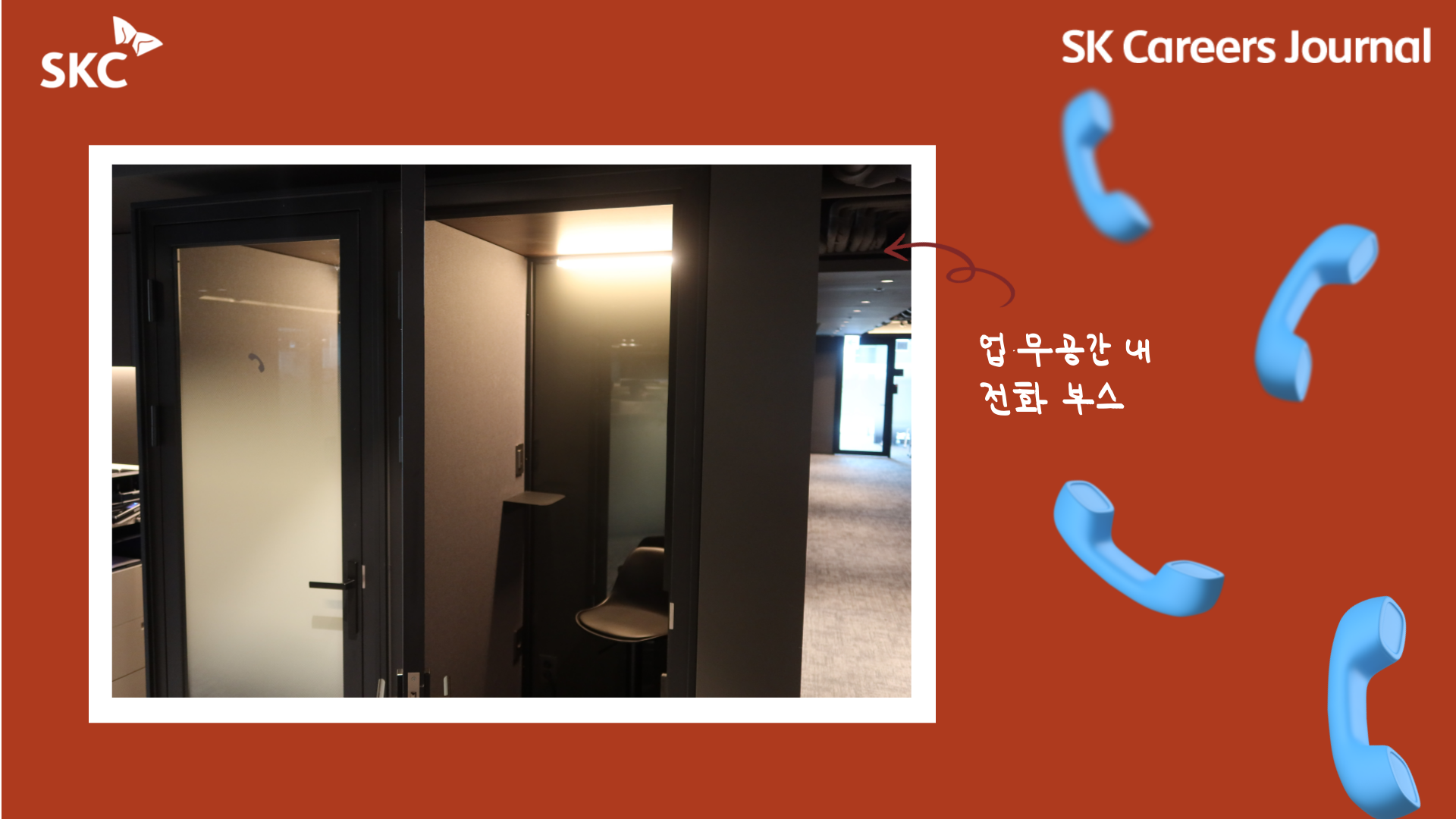 그리고 업무 중 급한 전화를 받아야 할 때, 다른 구성원을 배려할 수 있게 해주는 전화 부스📞도 각 층에 위치하고 있습니다. 의자에 앉아 편하게, 작은 테이블에서 필요한 것들을 메모하며 업무 전화를 받을 수 있다니, 모든 걸 다 갖추었죠? 사소한 디테일까지 놓치지 않고 구성원에게 최상의 업무 환경을 제공하는 SKC의 진심, 대단하지 않나요?