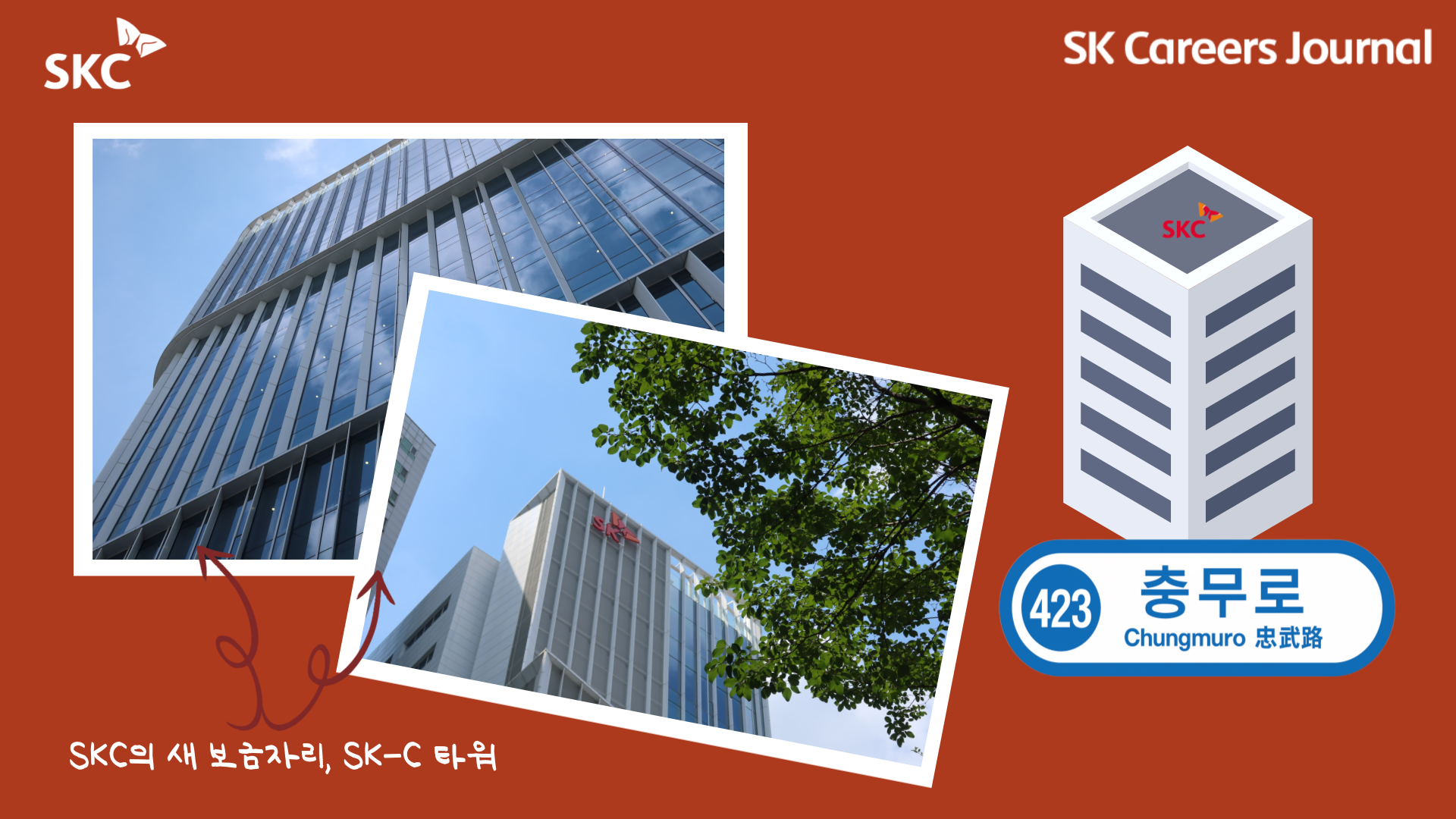 SKC는 광화문을 떠나 2025년 봄, 충무로역 인근에 위치한 SK-C타워에 새 보금자리를 틀었습니다. 지하철 노선 3개🚊가 인근에 있는 교통의 요충지이자, 구성원의 의견을 적극 반영한 새로운 시설들로 가득한 사옥은 SKC family에게 만족감과 자긍심을 주고 있다고 하는데요.