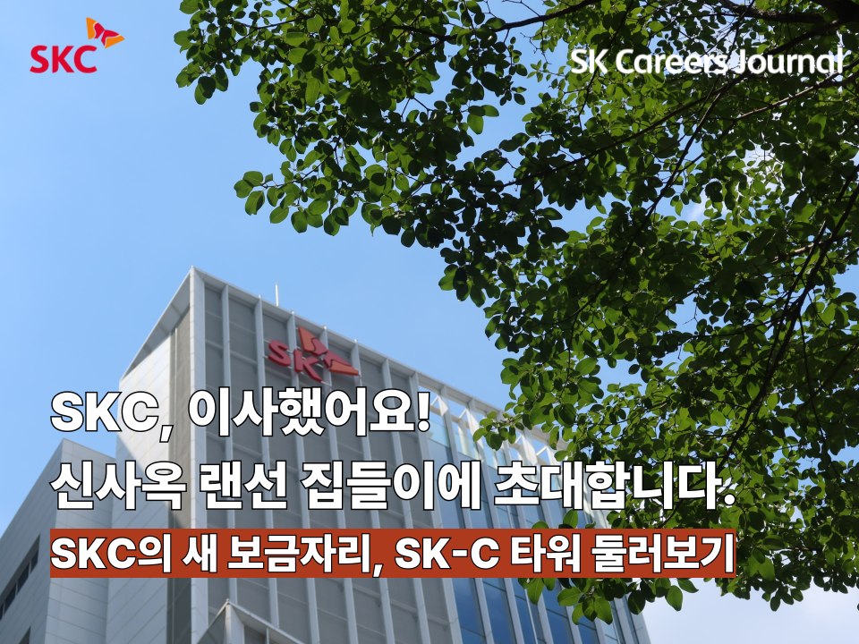 최근 SKC가 사옥 이전🏠을 했다는 소식, 알고 계셨나요? SKC의 새 보금자리에 초대받아 발빠르게 ‘집들이’에 다녀와보았는데요, 직접 방문해 들은 다양한 이야기부터 생생한 사진까지, 풍부한 볼거리로 SK-C 타워를 소개🔍해드리고자 합니다.