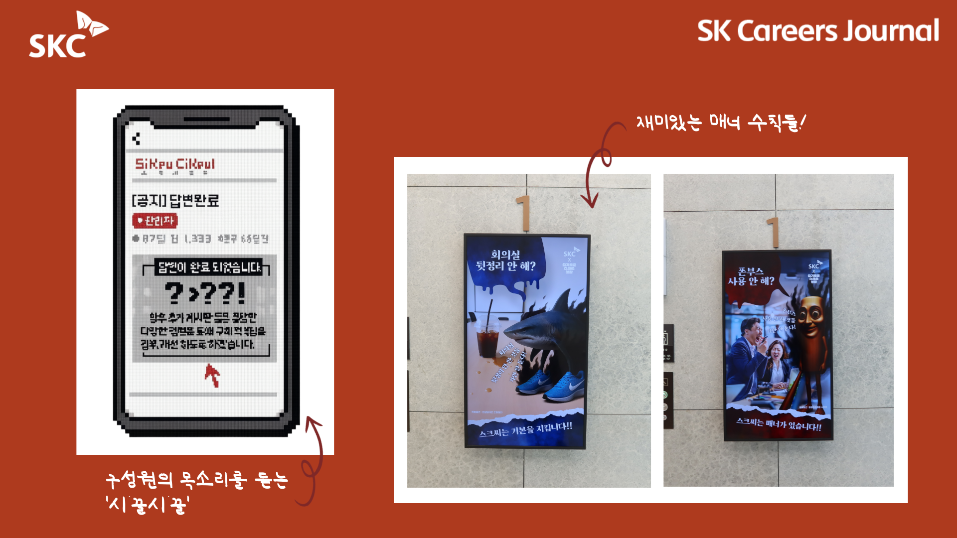 또한, 엘리베이터를 기다리며 사내 매너를 위해 SKC 구성원들이 직접 제작한 캠페인을 보기도 했는데요. 최근 유행한 밈의 캐릭터들을 활용하고, 젊은 목소리를 가득 담아 매너 수칙을 재미있게 풀어냈지 않나요? 모두가 목소리를 낼 수 있고, 이를 경청하는 SKC의 분위기를 잘 보여주는 사진🗣️🎧이라고 생각해 여러분께 소개해 드리고 싶었습니다.