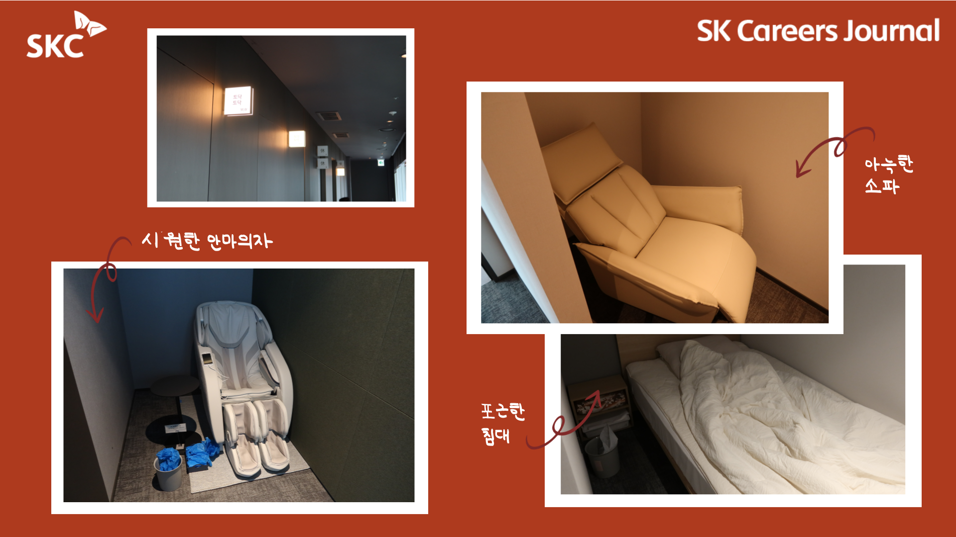 라운지 뒤쪽 복도에 보이는 이 간판들은 뭘까요? 바로 SKC 구성원을 위한 휴식공간입니다. 각 간판별로 다른 문구가 쓰여있듯, 다양한 공간이 마련되어 있는데요, 침대가 있는 수면실😴, 시원한 안마의자실💆, 그리고 개별 휴식이 가능한 소파가 마련된 휴게 공간🛋️까지, 각 구성원의 다양한 니즈를 반영한 휴식 공간은 SKC 구성원의 고된 피로를 풀어준다고 합니다.