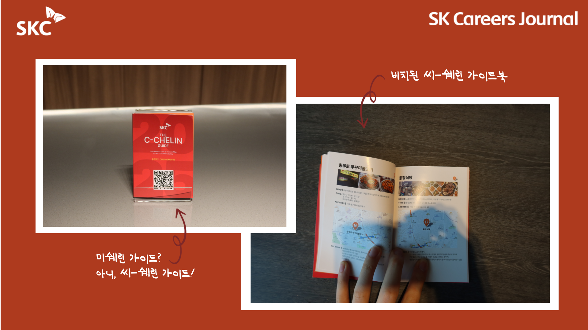 먼저, C-chelin Guide🍽️인데요, 충무로로 보금자리를 옮겨 구내식당 밖에서 식사를 하는 경우, 카페를 가는 경우 SKC 구성원이 조금이라도 더 맛있고, 좋은 곳을 가면 하는 바램으로 도움을 주기 위한 ‘미쉐린 가이드’의 SKC 버전 가이드북입니다.