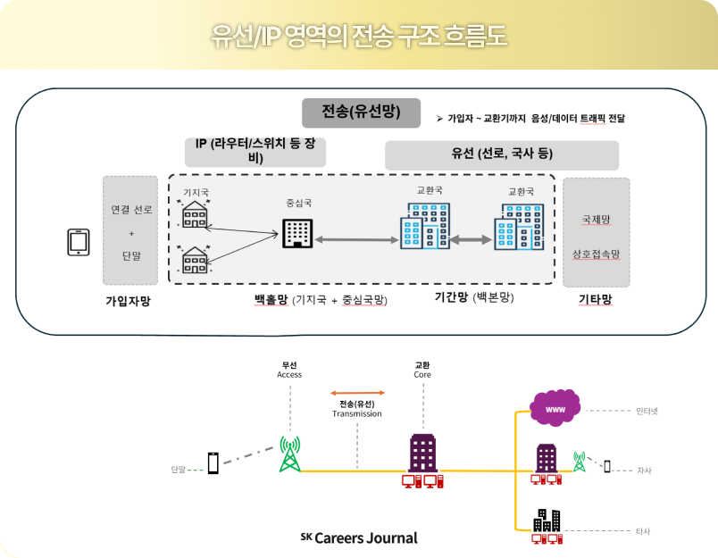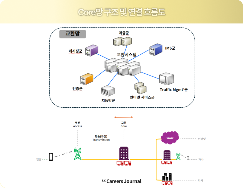 통신망은 데이터가 흐르는 경로에 따라 네 가지로 나뉘어요.단말기와 기지국 간 데이터를 주고받는무선망(Access),이를 유선 케이블로 중앙 서버에 전달하는유선망,수신된 데이터를 전화·인터넷 등으로 처리하는Core망,마지막으로 장비가 설치된 공간의 전력·냉방·소방 등을 관리하는설비영역까지 포함됩니다.