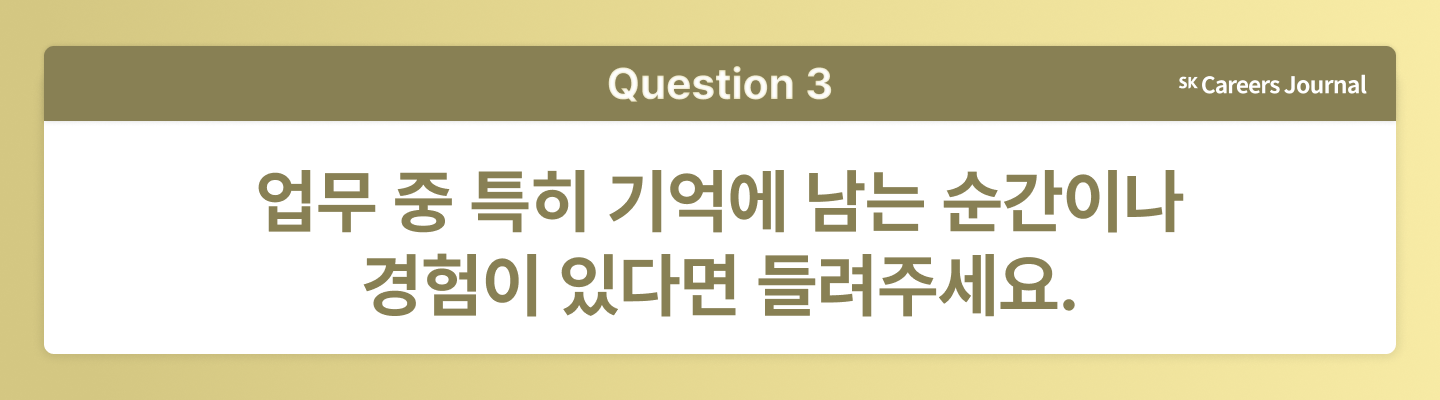 보성님(Core):SK텔레콤은 도전할 수 있는 분야가 정말 다양하고,스스로 기회를 만들어갈 수 있는 환경이 잘 갖춰진 회사입니다.저 역시 외부에서 소개할 때 늘‘기회의 폭이 넓은 회사’라고 이야기하곤 해요.꿈을 가진 분들이 이곳에서 함께 성장해 나가길 진심으로 기대하고 있겠습니다.
