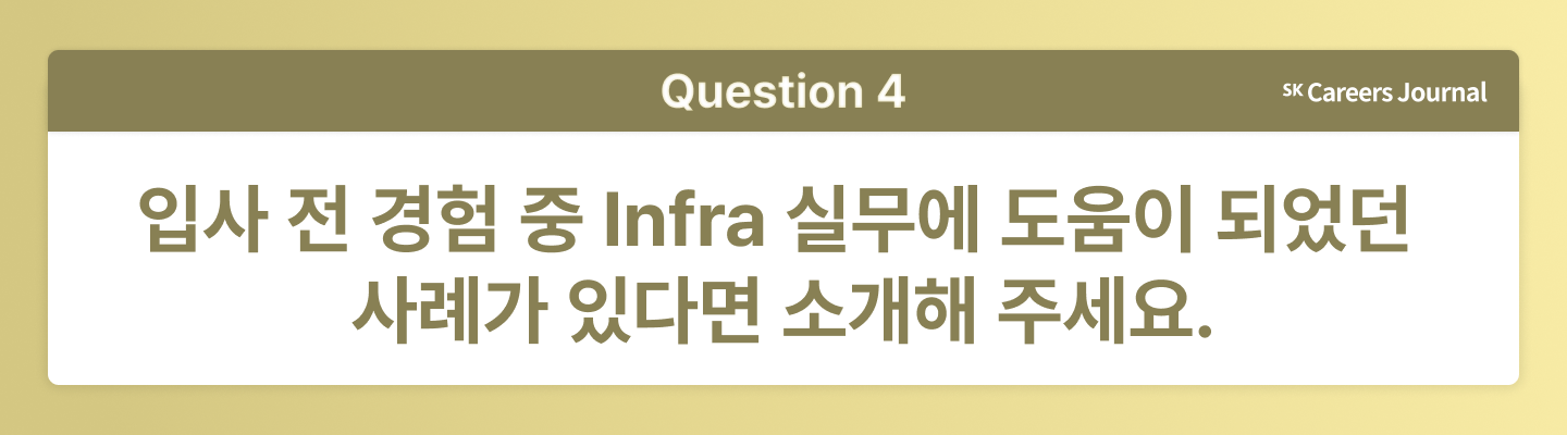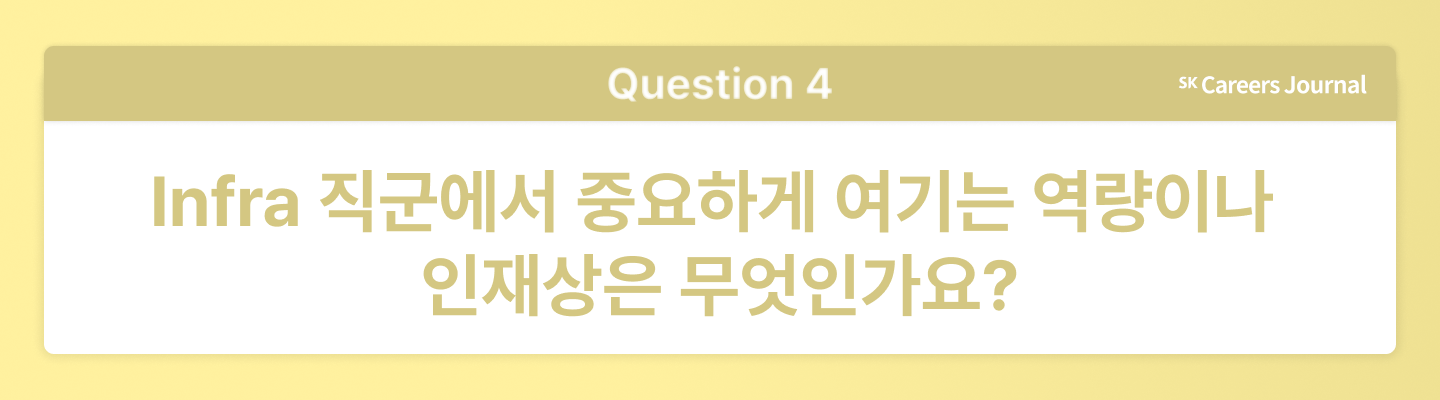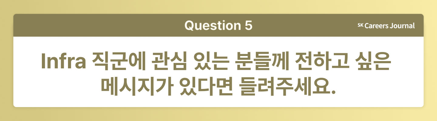 정우님(설비):저도 처음Infra직군에 지원할 때는 자격증도 없고,관련 이해도도 부족했어요.하지만 이전 경험에서 느낀 점과 배운 점을 솔직하게 풀어내며,주어진 과제를 끝까지 책임지려는 태도를 보여드리려고 노력했죠.그런 진심이 닿았던 덕분인지,지금은 제가 희망했던Infra업무를 맡고 있어요.처음이 두려울 수 있지만,관심이 있다면 꼭 도전해 보셨으면 합니다.진심으로 응원합니다!