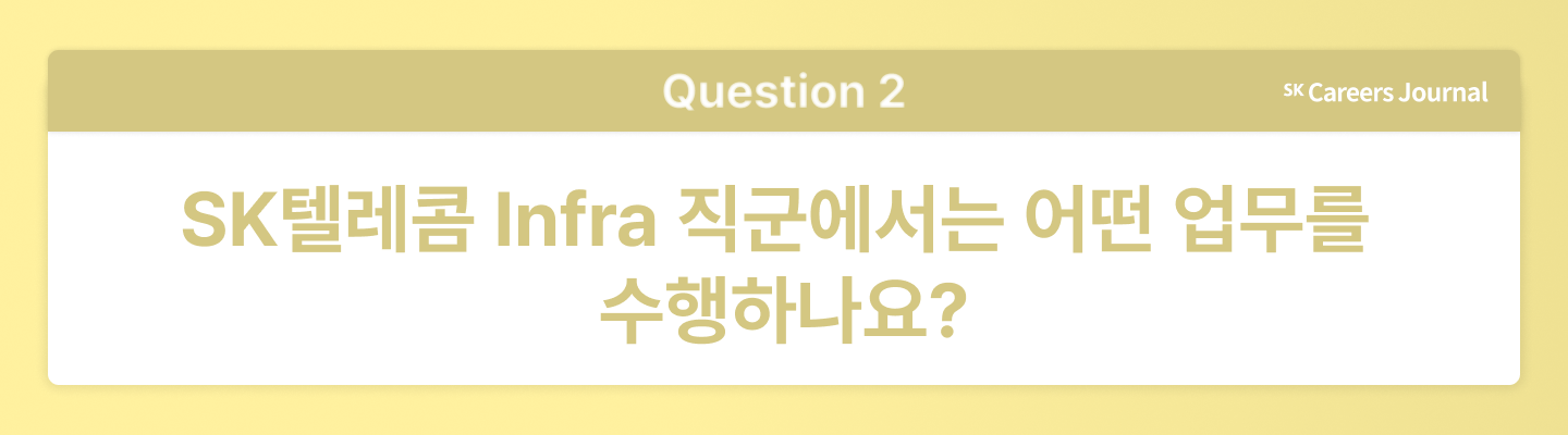 경주님:SK텔레콤의Infra직군은고객이 통신 서비스를 안정적으로 이용할 수 있도록,전체 통신망을설계하고 구축한 뒤 지속해서운영·관리하는 역할을수행합니다.