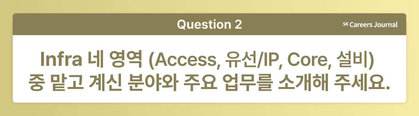 이번 인터뷰를 통해,통신의 시작과 연결,안정적인 운영까지SK텔레콤Infra직군이 어떤 구조와 흐름 속에서 움직이고 있는지 더 가까이에서 들여다볼 수 있었습니다.