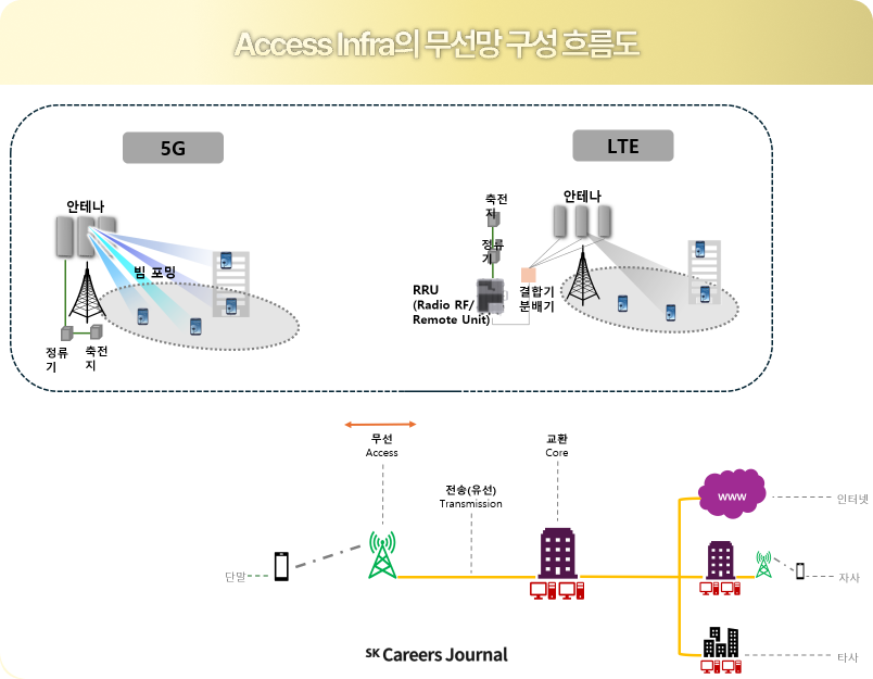 ①Access영역은 고객과 가장 가까운 위치에서 통신 서비스를 제공하는 기지국,안테나 등 무선 장비의 설계와 운용을 담당합니다.주요 업무는 세 가지로 나뉘는데요.