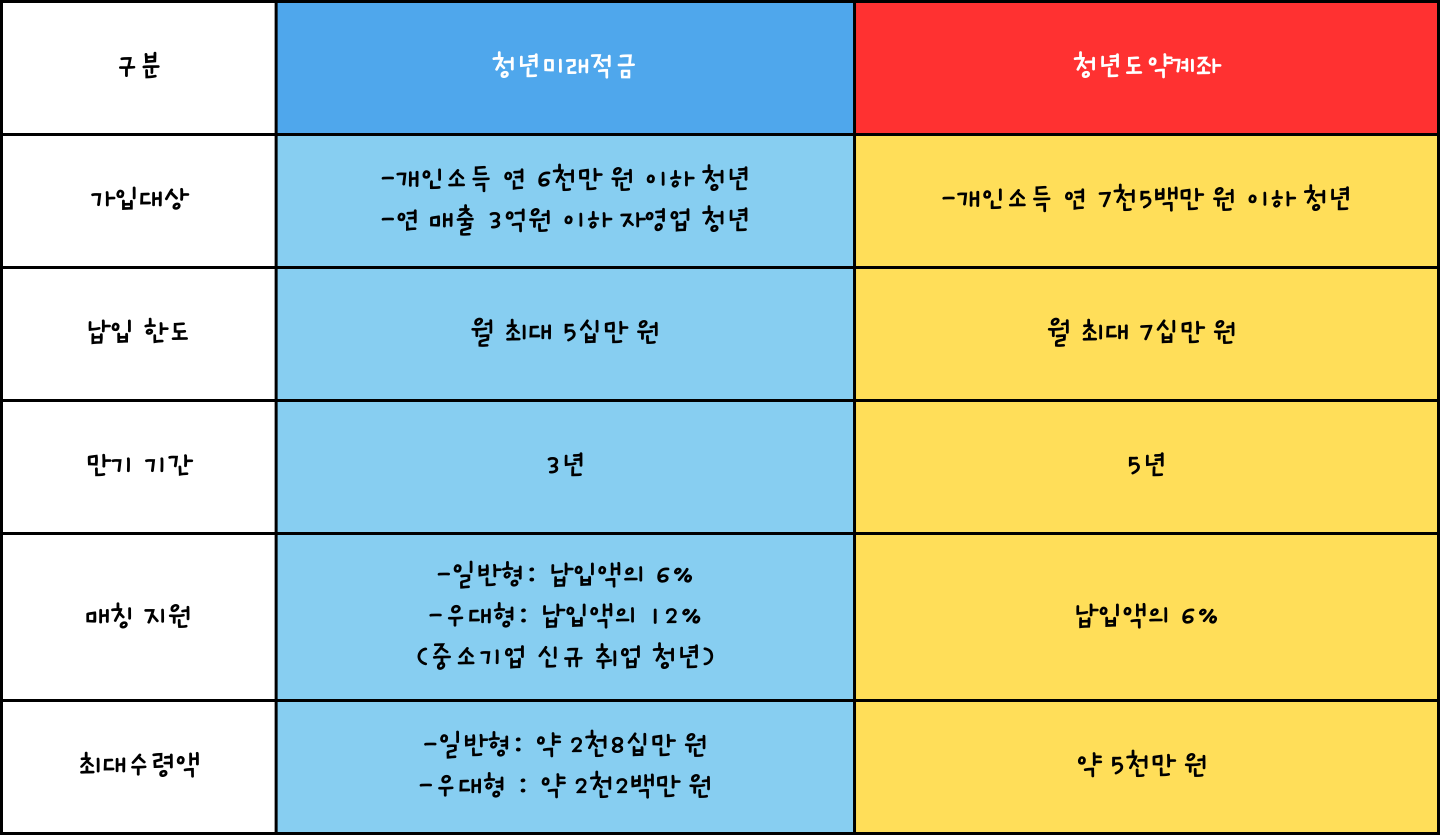 다음은 청년미래적금과 청년도약계좌를 비교한 표 입니다. 표를 보고 본인에게 맞는 재테크를 선택해보세요.