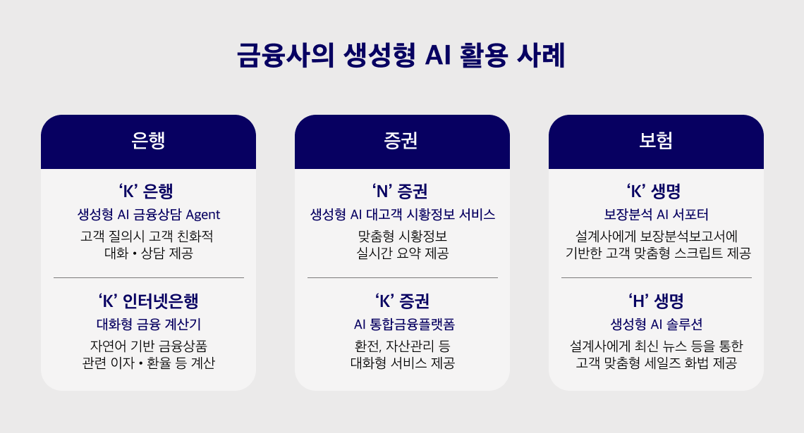 HOW: 금융사의 생성형 AI 활용 사례 금융사들의 생성형 AI 활용은 기술 시연을 넘어 실제 서비스로 확산되고 있으며, 은행,증권, 보험 등에서 차별화된 모델을 통해 소비자 접점을 정교하게 설계할 수 있는 가능성을 증명하고 있습니다. 이러한 흐름은 금융위원회의 규제 특례를 기반으로 클라우드와 내부망 AI를 병행 활용하면서, 산업 전반으로 빠르게 확산되고 있음을 의미합니다.