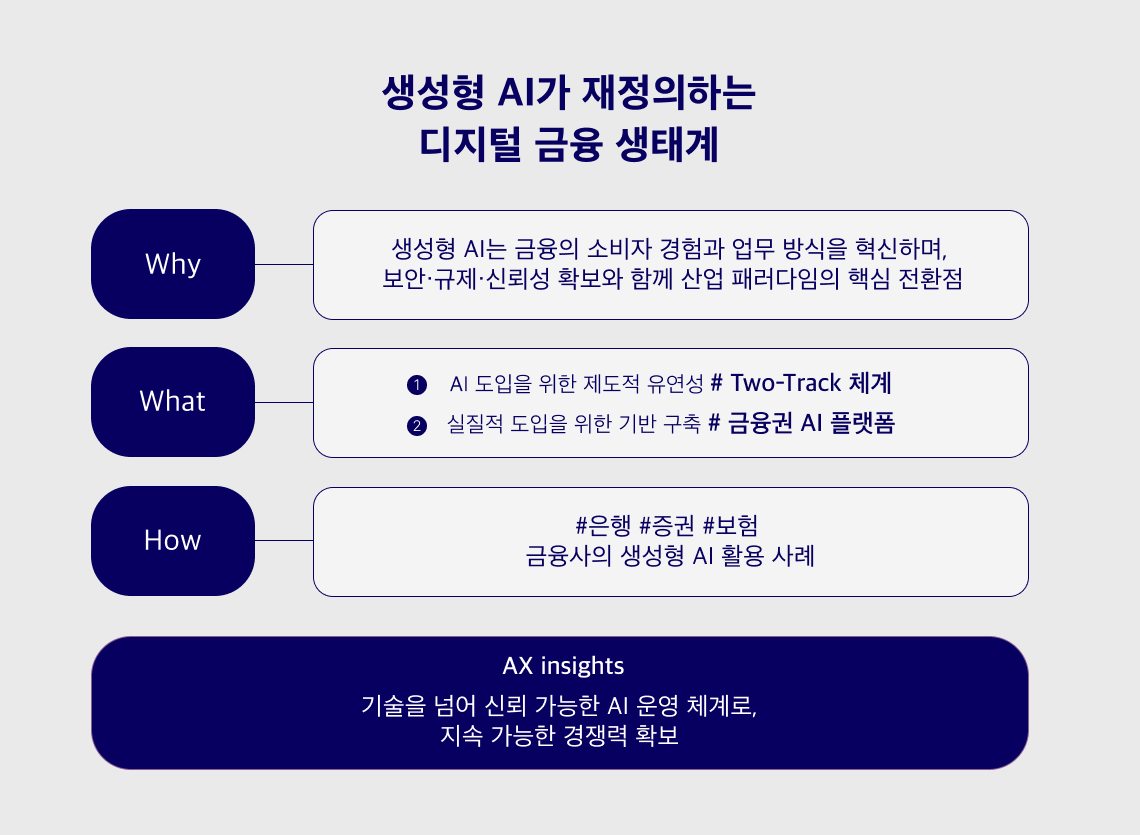 WHY: 금융과 생성형 AI의 만남 금융 산업은 보수적 규제와 복잡한 시스템 구조로 인해 디지털 전환이 더디게 진행되어 왔습니다. 그러나 생성형 AI의 등장은 단순 데이터 분석을 넘어 자연어 이해·상담·정보 요약·투자 제안까지 수행하며, 금융 서비스의 소비자 경험과 업무 방식을 근본적으로 혁신하고 있습니다. 이로 인해 금융회사는 더 이상 기술 도입을 미룰 수 없으며, 동시에 보안·규제·신뢰성을 충족할 수 있는 제도적 기반과 인프라 마련이 필수 과제로 부상했습니다. 따라서 금융과 AI의 결합은 이제 단순한 기술 도입이 아니라, 산업 패러다임을 바꾸는 전환점이 되고 있습니다.