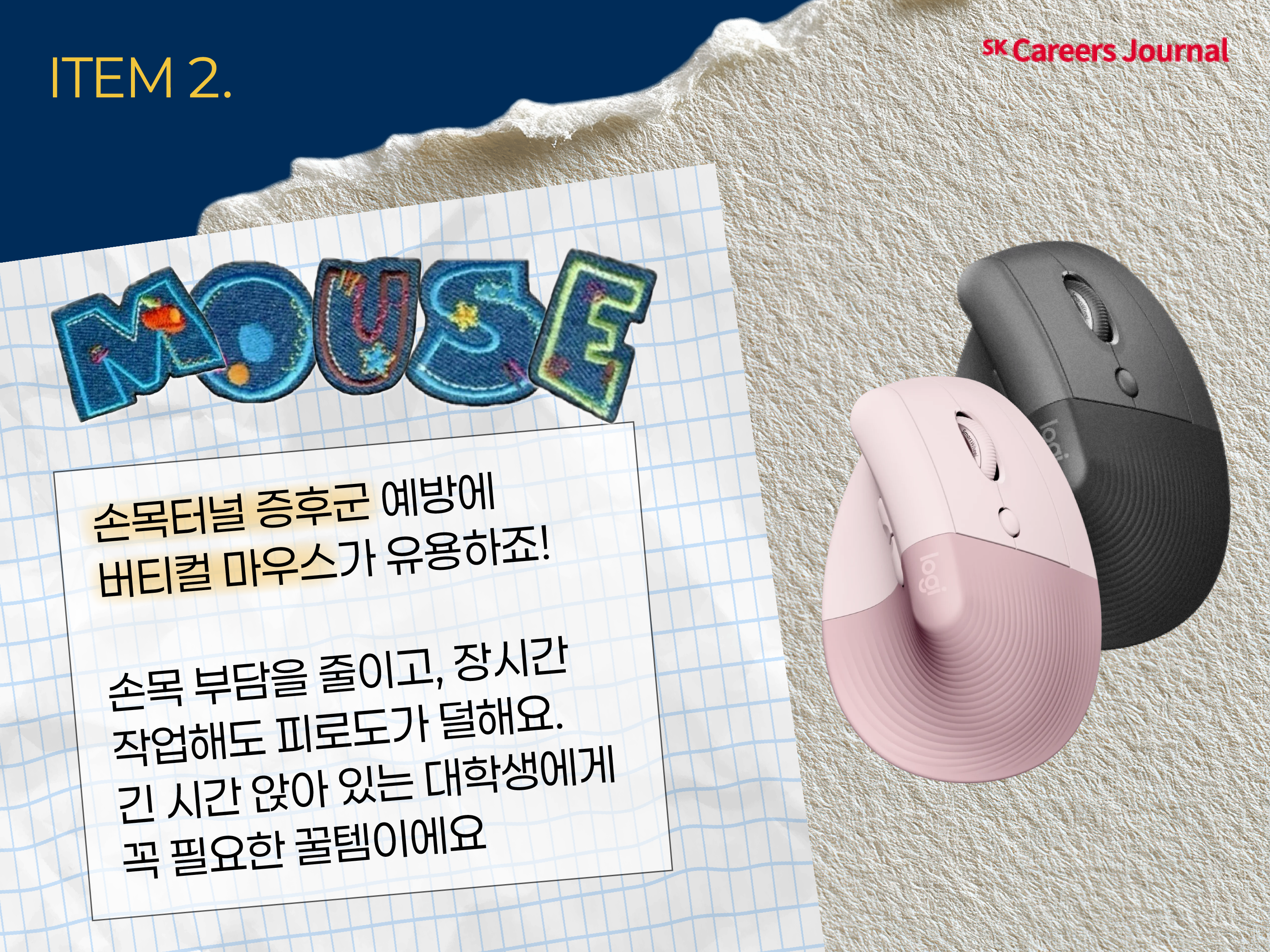 손목터널 증후군 예방에 버티컬 마우스가 유용하죠! 🖱️ 일반 마우스보다 손목을 자연스러운 각도로 유지해 손목 부담을 줄이고 장시간 작업해도 피로도가 덜해요. 긴 시간 앉아 있는 대학생에게 꼭 필요한 꿀템입니다.
