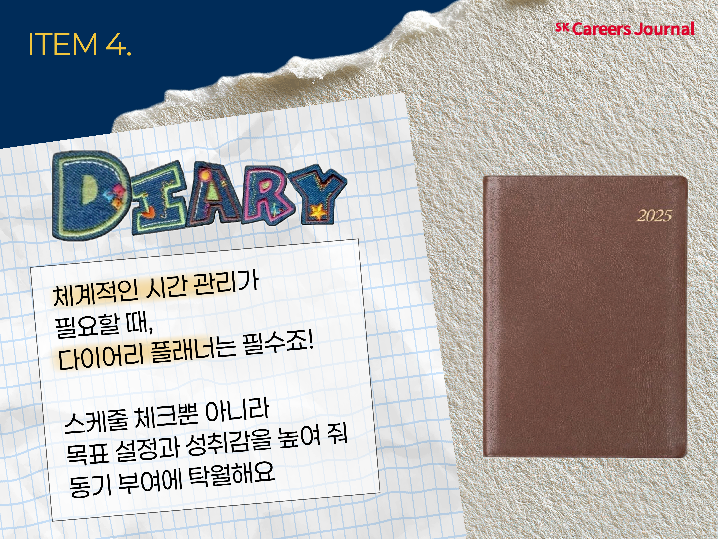 체계적인 시간 관리가 필요할 때 다이어리 플래너는 필수죠! 📓 시험, 과제, 미팅 등 스케줄 체크뿐 아니라 목표 설정과 성취감을 높여 줘 집중력과 동기 부여에 탁월합니다. 특히 막학기 계획이 빡빡한 제게 꼭 맞는 아이템입니다.
