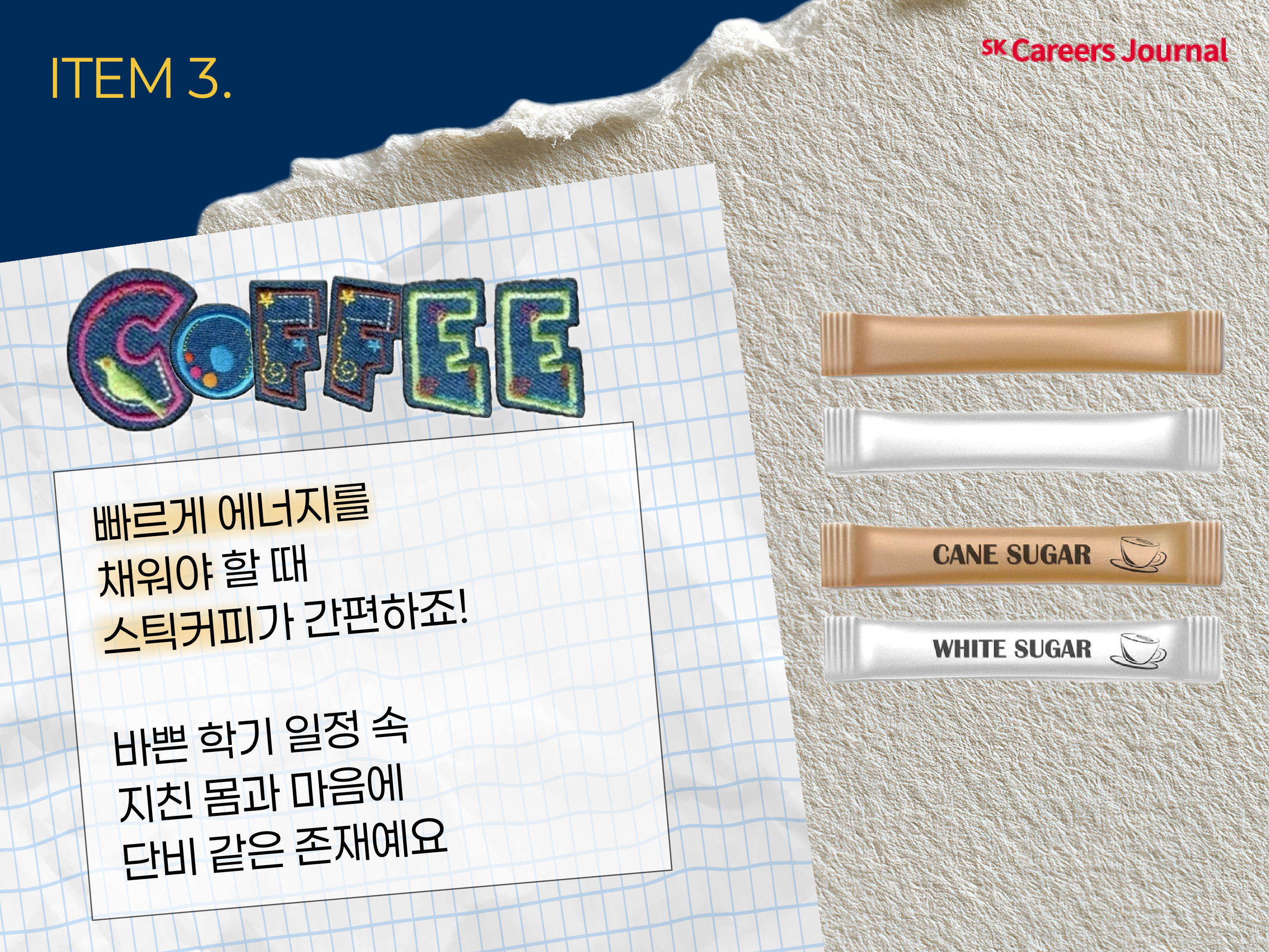 빠르게 에너지를 채워야 할 때 스틱커피가 간편하죠! ☕️ 공부할 때 또는 이동 중에도 쉽게 마실 수 있어 활력 유지에 도움이 됩니다. 바쁜 학기 일정 속 지친 몸과 마음에 단비 같은 존재예요. 👊🏼