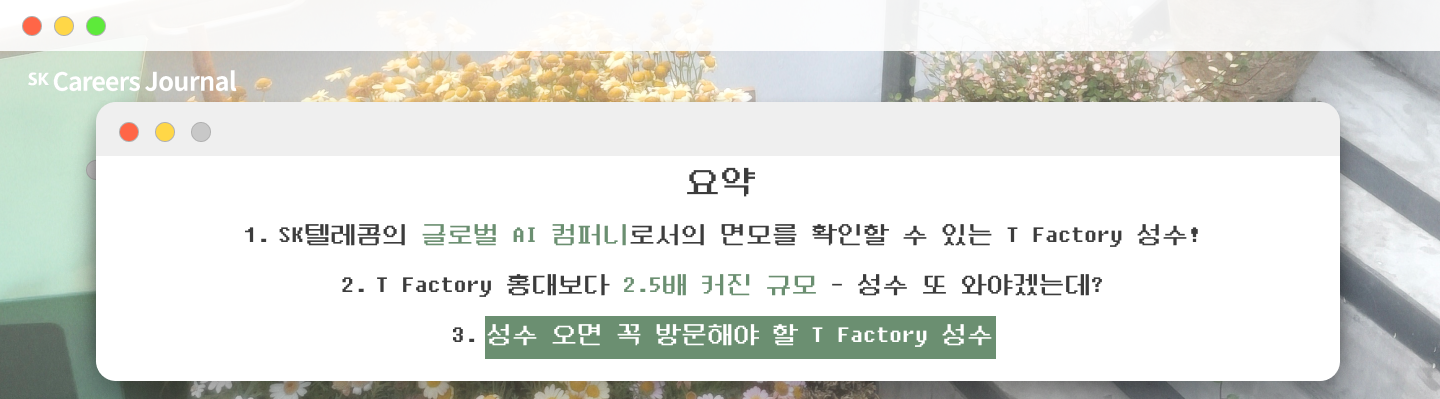 SKT는 T Factory 성수를 단순 전시관이 아닌 체험형 복합문화공간으로 만들어, 젊은 세대와 더욱 활발히 교감하는 새로운 문화 소통의 장으로 키워나갈 계획입니다. 성수동의 새로운 핫플레이스, T Factory 성수에 직접 방문하여 SK텔레콤 티팩토리팀 손누리 담당자님께 티팩토리에 대한 자세한 이야기를 담아왔습니다.