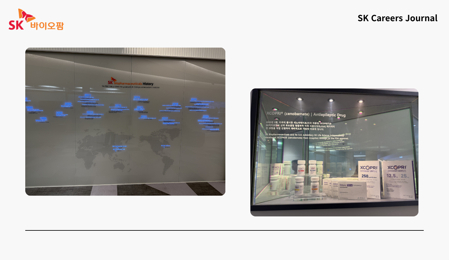 공간 한쪽에는 SK바이오팜의 연혁도 있었어요. 창립 초기부터 세계 시장 진출에 이르기까지 회사가 걸어온 길이 한눈에 보였는데요. SK바이오팜의 성장 스토리를 시각적으로 표현한 공간이었습니다.