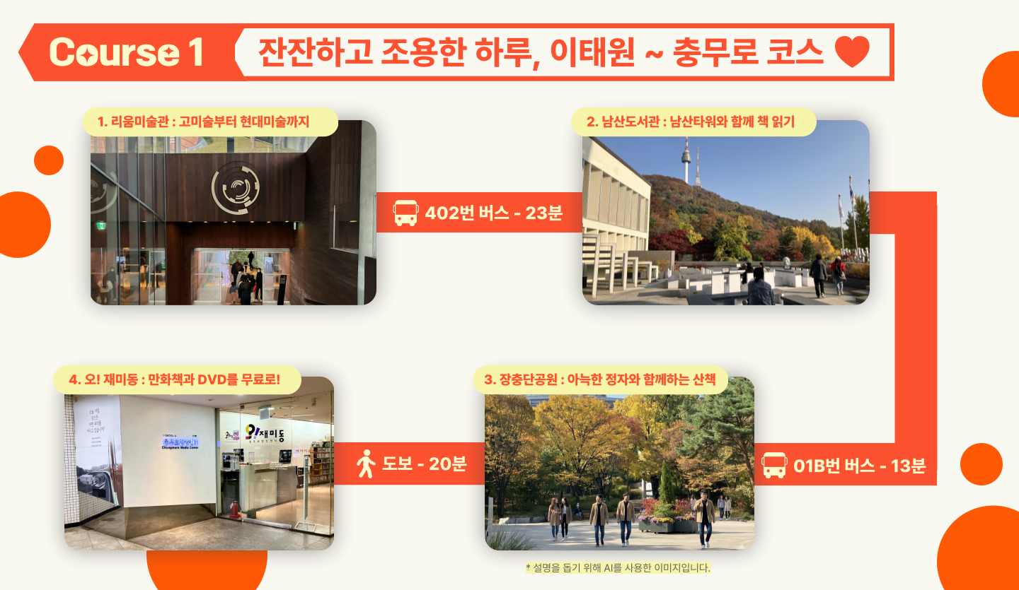 그래서 제가 나섰습니다! “돈 없는 사람은 연애도 하지 말라고?!ㅠㅠ”라는 말은 인제 그만! 서울 곳곳에는 지갑 없이도 특별한 추억을 쌓을 수 있는 숨은 명소들이 생각보다 많다는 사실, 알고 계셨나요? 분위기 좋은 도서관부터 감성 있는 공원, 교양 넘치는 미술관까지! 많은 공간이 텅장러들의 사랑을 지켜주고 있답니다.여러분의 다채로운 데이트를 위해 서로 다른 매력을 가진 두 가지 서울 0원 데이트 코스를 준비했으니, 연인의 취향에 맞춰 선택해 보세요!