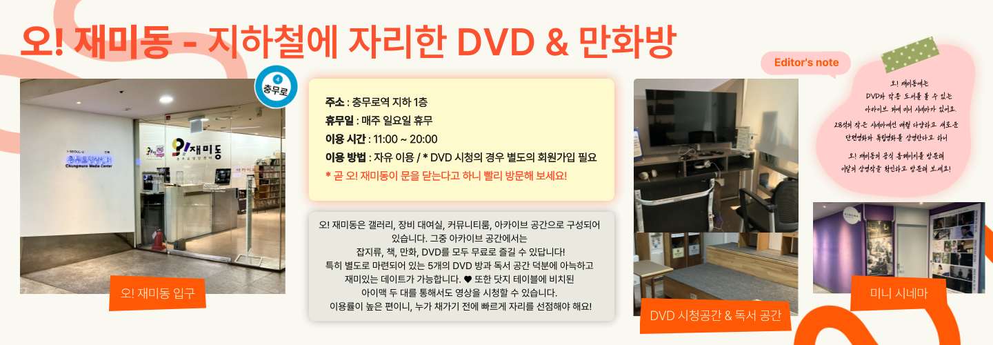아무리 잔잔한 걸 좋아하는 연인이어도 재미가 필요한 법! 다음 장소는 충무로역에 있는 오!재미동 입니다. 오!재미동은 서울시가 지원하고 서울영상위원회가 운영하는 공공 영상문화 공간으로, 누구나 방문해 영상문화의 매력에 대해 알아갈 수 있다는 점이 매력입니다. 전시를 진행하는 갤러리, 독립영화를 상영하는 극장(미니 시네마), DVD와 만화를 볼 수 있는 아카이브, 영화인들을 위한 교육 장소까지! 영화에 대한 열정과 존중이 느껴지는 많은 것들이 오! 재미동을 채우고 있습니다.