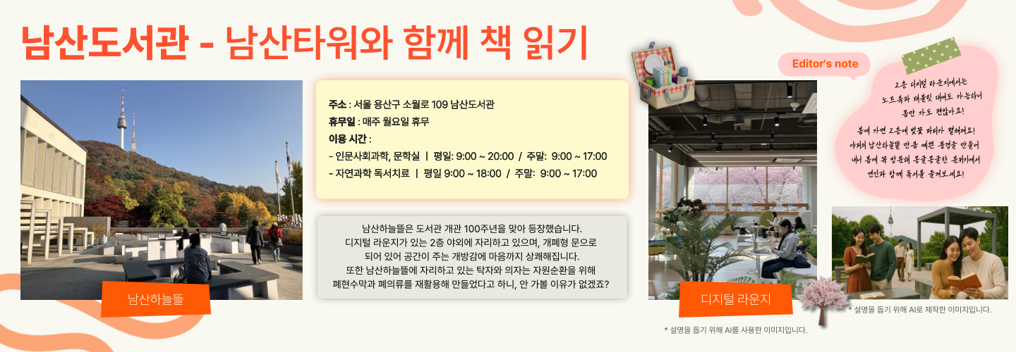 자, 미술품으로 교양을 한가득 채웠다면 이제는 책으로 교양을 쌓을 시간! 이곳은 서울 남산 끝자락에 있는 서울특별시교육청 남산도서관입니다. 남산도서관의 핵심 공간은 바로바로! 2층인데요. 남산타워가 한눈에 보이는 야외 공간 ‘남산하늘뜰’과 벚꽃을 눈에 한가득 담을 수 있는 ‘디지털 라운지’가 자리 잡고 있기 때문입니다.