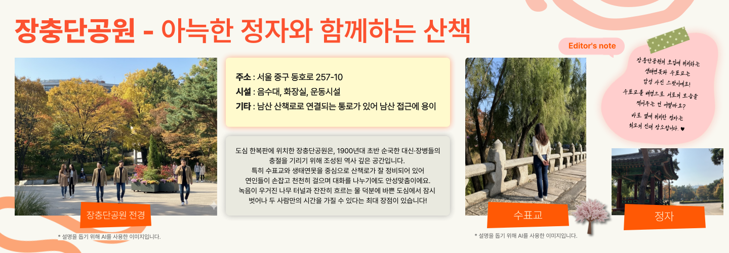 장충단공원은 중구 장충동에 있는 공원으로, 영조 때부터 일제강점기 때까지의 기록이 선명히 남아 있는 역사적인 공간이라고 할 수 있습니다. 공원을 둘러싼 단풍나무들과, 수표교 아래 잔잔히 흐르는 연못이 너무나도 매력적이에요. 특히 공원 초입에 있는 정자는 최고의 대화 장소이니 놓치지 마세요!