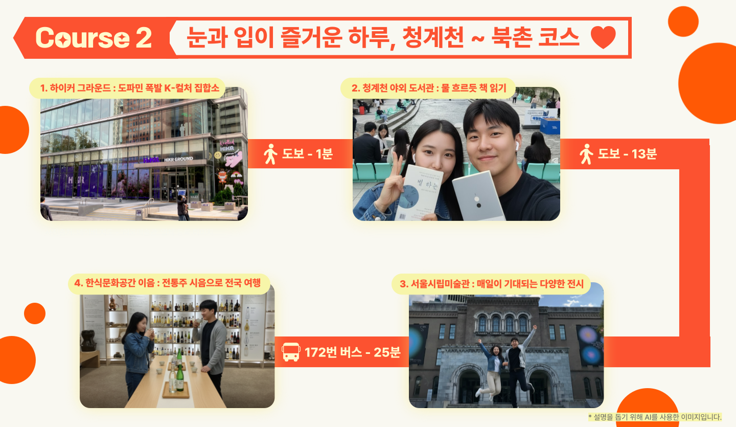 두 번째 데이트 코스는 활기찬 도심 속에서 다양한 경험을 하며 오감을 만족시킬 수 있는 코스입니다. 트렌디한 공간에서 시작해 고즈넉한 북촌까지, 새로운 볼거리와 맛있는 즐길 거리가 가득해 데이트 내내 생기가 넘칠 거예요! 평소 동적인 데이트를 좋아하거나, 다채로운 감각을 통해 서로에게 신선한 즐거움을 선사하고 싶은 커플에게 강력히 추천합니다.
