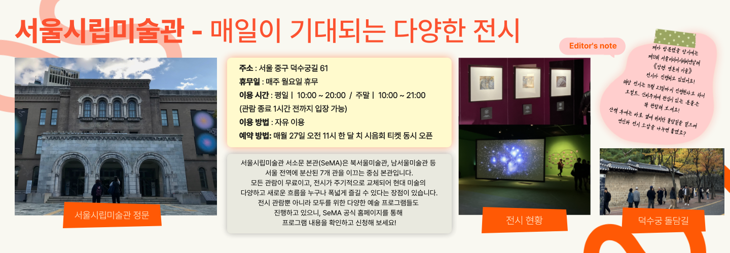 서울시립미술관의 가장 큰 특징은 전시가 끊임없이 교체된다는 점인데요, 덕분에 방문할 때마다 현대 미술의 다채로운 흐름을 새롭게 경험할 수 있으며, 미술관의 슬로건처럼 ‘매일이 기대되는 다양한 전시’를 만날 수 있습니다.