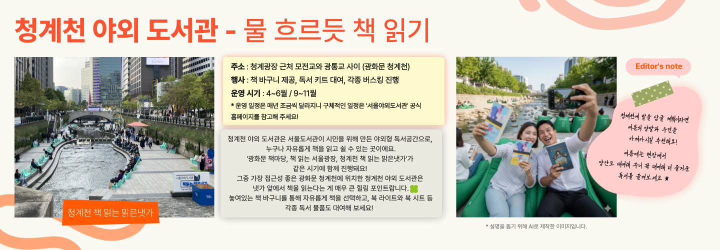 상반기와 하반기로 나누어 진행되고, 청계천뿐 아니라 광화문 광장, 서울 광장에서도 진행되니 야외 도서관 도장 깨기에 도전해 보아도 좋을 것 같습니다. 🤓