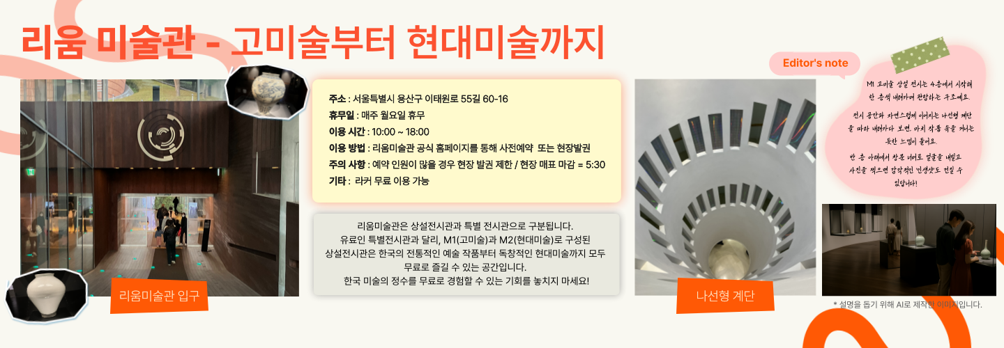 코스를 여는 첫 장소는 바로 용산구 이태원에 있는 리움미술관입니다! 리움미술관은 삼성 문화재단에서 세운 미술관으로, 이건희 전 삼성전자 회장의 미술품 국가 기증의 뜻을 계승하는 의미에서 21년 10월부터 상시 무료로 운영되고 있습니다. 무료로 운영되는 상설전시관에는 M1, M2가 있는데요, M1 전시관에선 고미술을, M2 전시관에선 현대 미술 소장품을 관람할 수 있습니다. 한국의 미술 변천사를 들여다보기 딱 좋겠죠?
