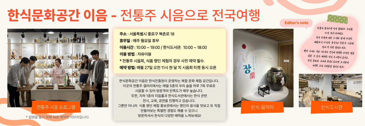 하지만 제가 오늘 집중적으로 소개할 곳은 바로 전통주 갤러리입니다! 이음 내부에 자리한 전통주 갤러리는 우리 전통주의 맛과 가치를 널리 알리기 위해 만들어진 홍보관으로, 여기서 진행하는 무료 시음회에선 약 30분의 시간 동안 5~6개의 선별된 전통주를 시음할 기회가 주어집니다. 놀랍게도, 전통주 시음은 표만 있다면 무료입니다!매월 27일 오전 11시에 한 달 치 시음회 표가 동시 오픈된다고 하니, 놓치지 말고 예매에 성공하셔서 연인과 함께 전통주의 매력에 빠져보세요. 🍶