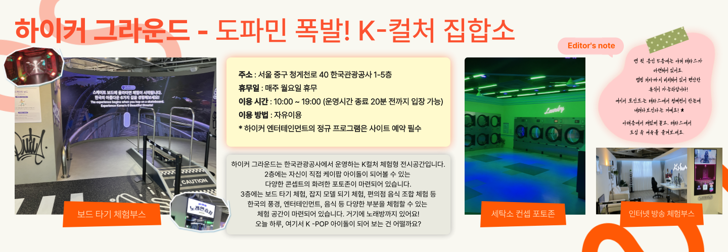 첫 번째 공간은 한국관광공사에서 운영하는 K -컬처 체험형 전시 공간, 하이커 그라운드 입니다! 1층부터 5층까지, 마치 거대한 놀이터처럼 꾸며져 있어 지루할 틈이 없습니다. 이곳의 핵심 공간은 바로 2층과 3층인데요. 먼저 2층에는 자신이 직접 뮤직비디오의 주인공이 되어볼 수 있는 다양한 콘셉트의 화려한 포토존으로 가득합니다. 세탁소부터 우주선, 지하철, 교실 콘셉트까지! 정말 다채로운 테마에서 커플 사진을 남길 수 있어요! 또한, 각 포토존에서는 나의 아이돌력을 높여줄 음악이 계속 흘러나오기 때문에 더욱 몰입감 있는 사진을 찍을 수 있어요. 특히, 조명의 컬러를 자신이 직접 조절할 수 있다는 점이 인상적이었습니다.