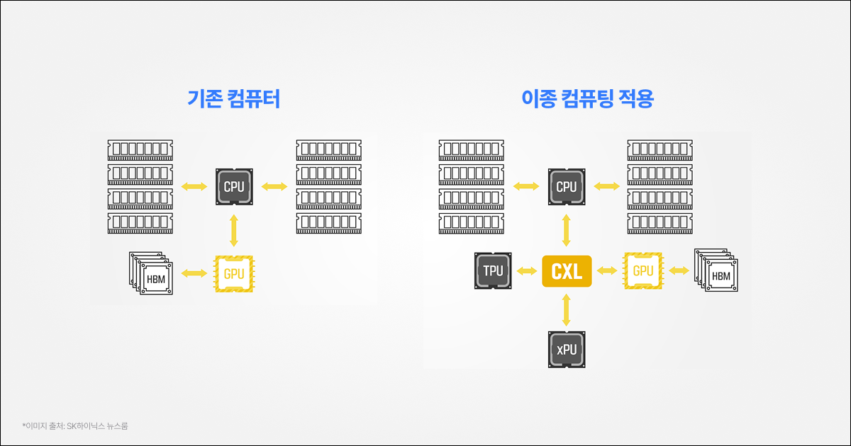CXL은 단순한 기술이 아니라 ‘서버 업계가 함께 정한 인터페이스 표준’입니다. 이 표준 덕분에 서버 안의 다양한 칩들이 하나의 큰 메모리를 유연하게 공유할 수 있고, AI 작업에 맞춰 가장 잘하는 연산을 나눠 맡는 ‘이종 컴퓨팅’ 구조가 가능해집니다.
