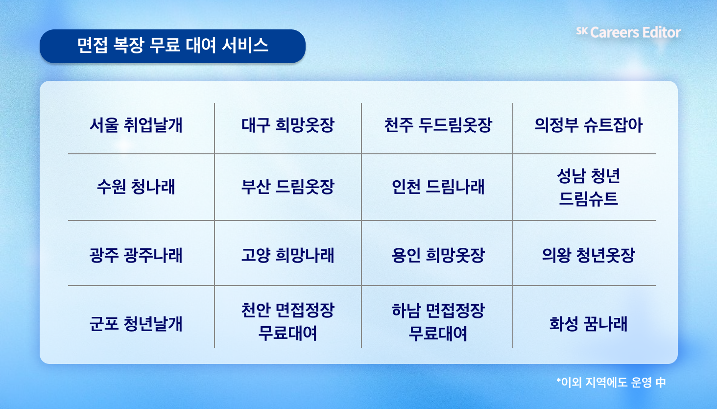 특히 면접 복장 무료 대여 서비스는 여러 지역에서 운영되고 있어, 취업 준비 과정에서 부담이 큰 정장 구매 비용을 크게 줄일 수 있는 제도입니다. 면접을 앞두고 계시다면 꼭 한 번 활용해 보시길 바랍니다.