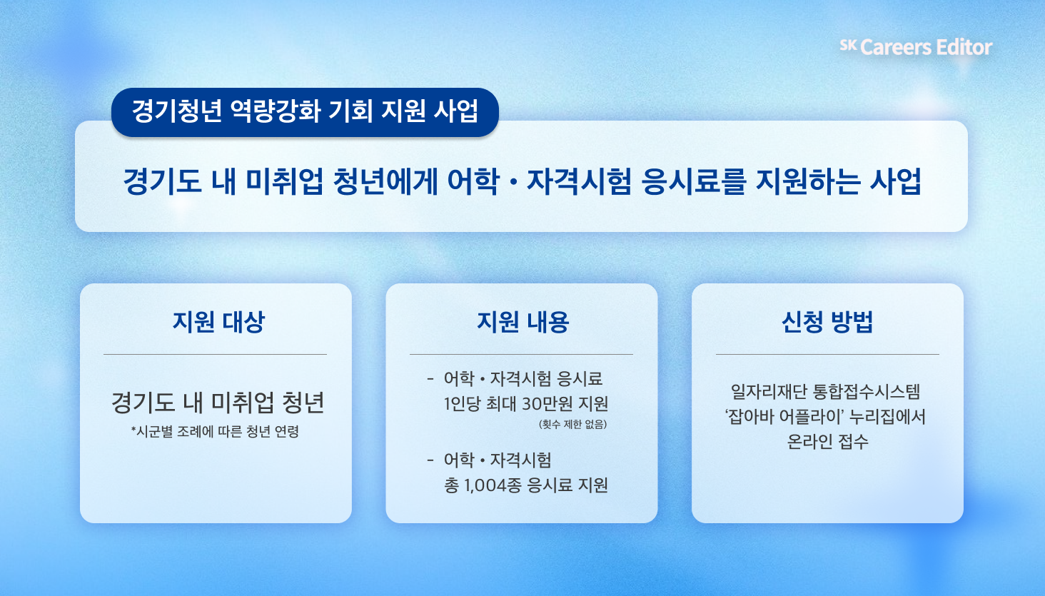 이 사업은 경기도 내 미취업 청년을 대상으로 어학·자격시험 응시료를 지원하는 프로그램으로, 취업 준비 비용 부담을 줄이고 보다 공정한 취업 기회를 제공하는 것을 목표로 합니다. 매년 많은 청년들이 신청하는 대표적인 지원 사업으로, 조기 마감되는 경우도 많아 미리 정보를 확인해 두는 것이 좋습니다!