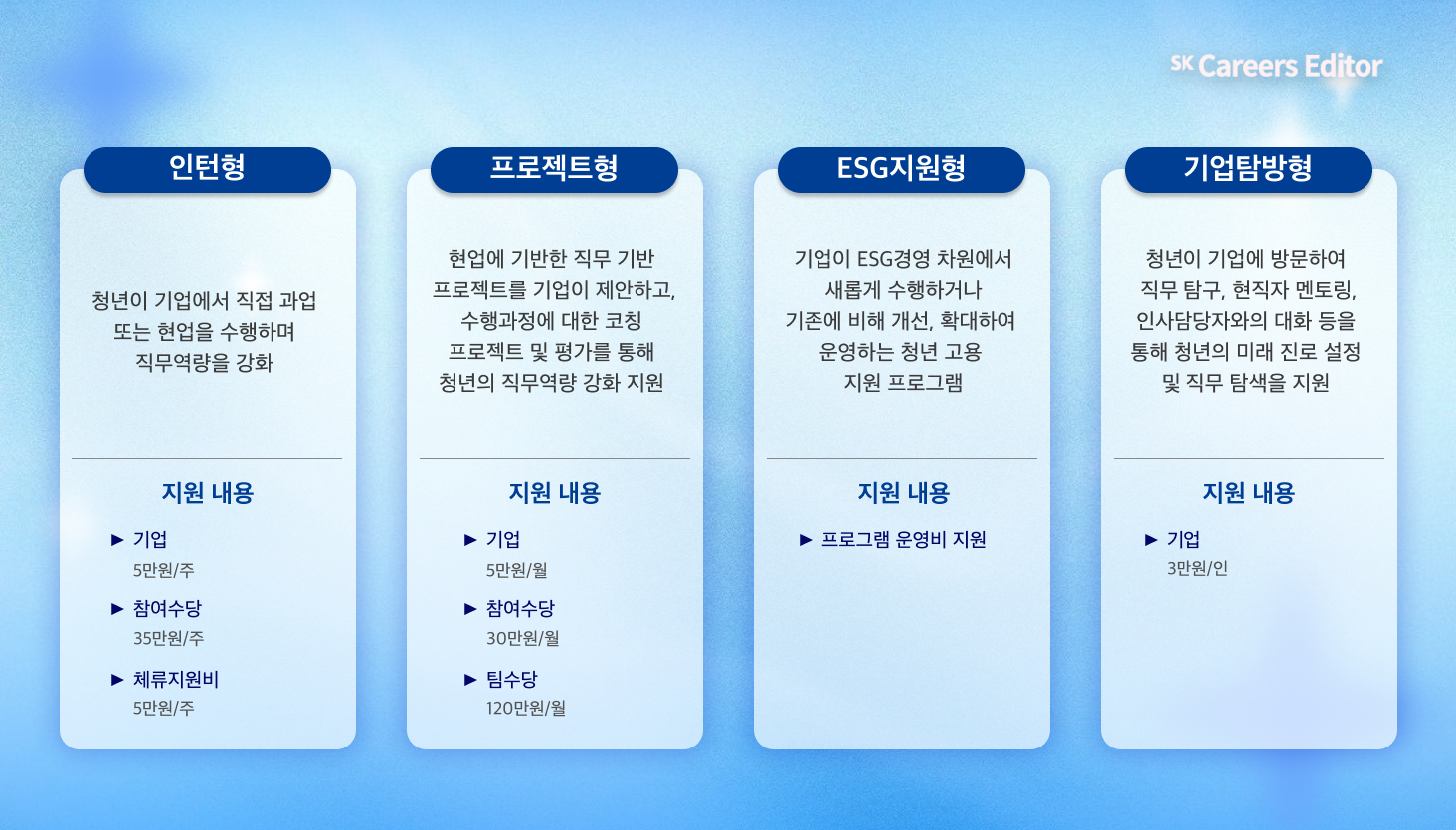 자신에게 맞는 유형을 선택해 직무 경험을 쌓을 수 있어, 실무 경험 부족과 공백기에 대한 부담을 동시에 줄이는 데 도움이 됩니다.