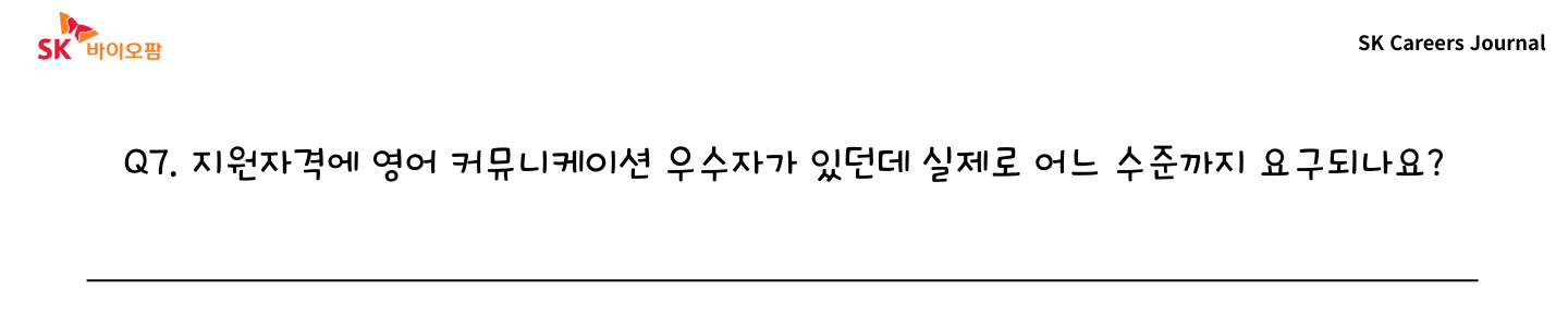 먼저 SK바이오팜의 주요시장은 미국입니다. 미국에 지사가 있고 실제로 HRD 업무에서도 미국 구성원들과 직접 커뮤니케이션해야 하는 경우가 많습니다. 그래서 영어는 업무 수행을 위해 기본적으로 갖춰야 하는 역량이라고 보시면 됩니다.