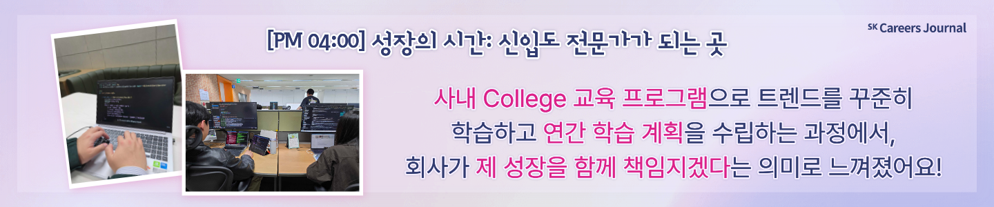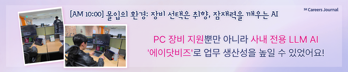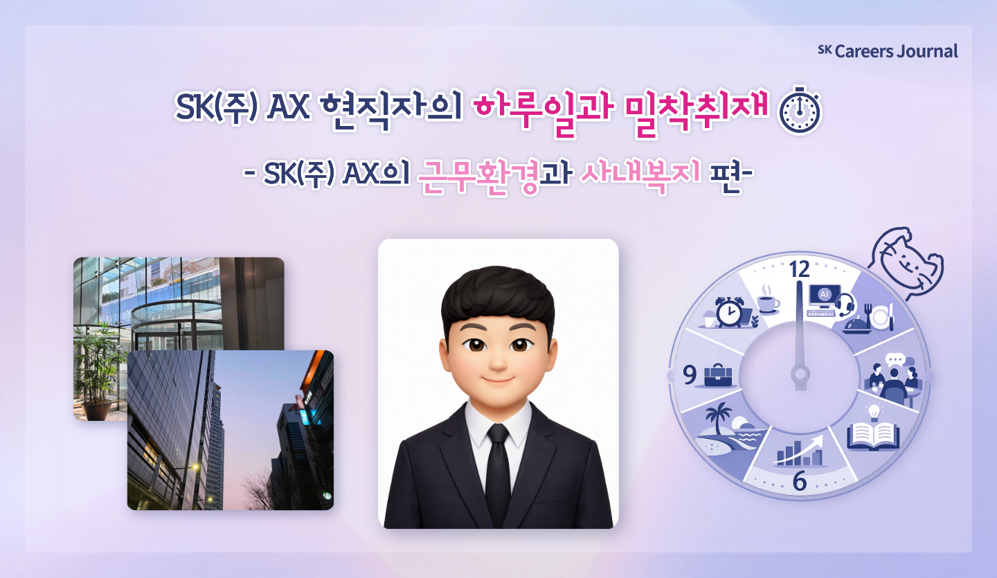 아침의 여유를 선사하는 유연근무제부터 개인의 성장을 뒷받침하는 수평적인 문화까지. 지금부터 SK㈜ AX 현직자의 목소리를 통해, 일과 삶이 완벽한 조화를 이루는 스마트한 하루를 가감 없이 소개해 드리겠습니다!