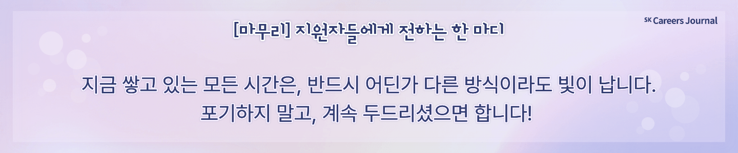 저도 취업을 준비하며 '쉽지 않다, 운동 많이 된다' 싶었던 순간들이 분명히 있었거든요. 그런데 돌이켜보면, 그 시간들이 저를 여기까지 데려가줬다 생각합니다💪 준비가 부족한 것 같고, 뒤처지는 것 같고, 언제쯤 될까 막막한 그 감정이 들 수 있어요. 뻔한 문장일 수도 있지만 지금 쌓고 있는 모든 시간은, 반드시 어딘가다른 방식이라도 빛이 납니다. 그렇기에포기하지 말고, 계속 두드리셨으면 합니다! SK㈜ AX에서 여러분을 기다리고 있겠습니다! ╰(*°▽°*)╯