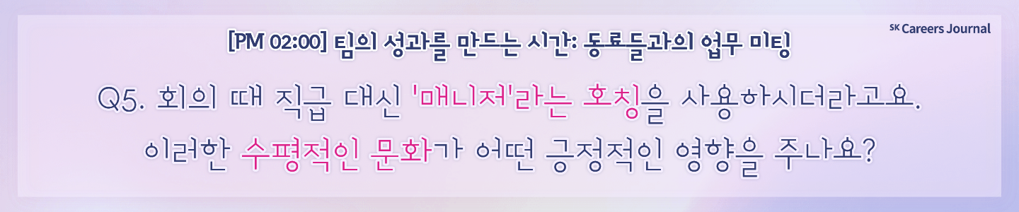 Q5. 회의 때 직급 대신 '매니저'라는 호칭을 사용하시더라고요. 이러한 수평적인 문화가 어떤 긍정적인 영향을 주나요?