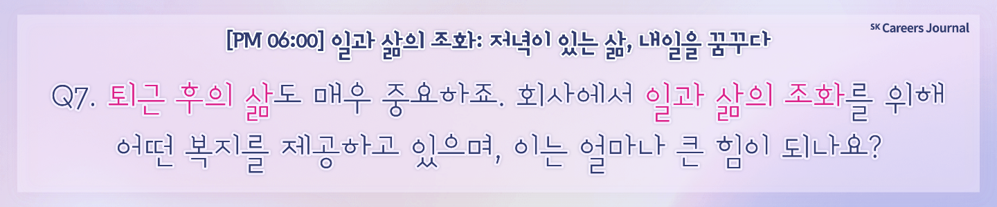Q7. 퇴근 후의 삶도 매우 중요하죠. 회사에서 일과 삶의 조화를 위해 어떤 복지를 제공하고 있으며, 이는 얼마나 큰 힘이 되나요?
