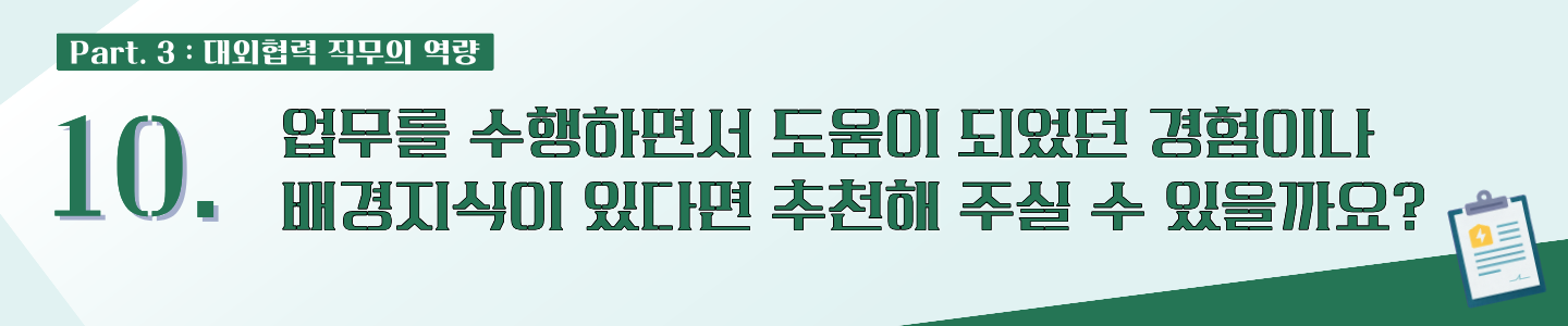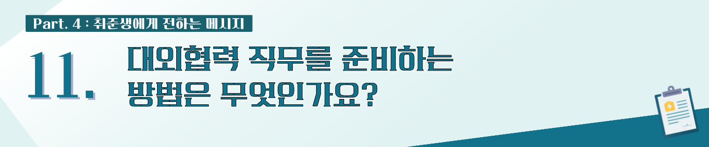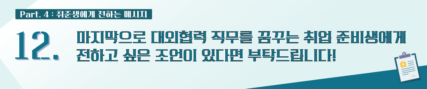 🎤김혜진 매니저님: 대외협력 직무는 겉으로 드러나는 정보가 많지 않아 취업 준비생에게 다소 낯설고 불확실하게 느껴질 수 있습니다.