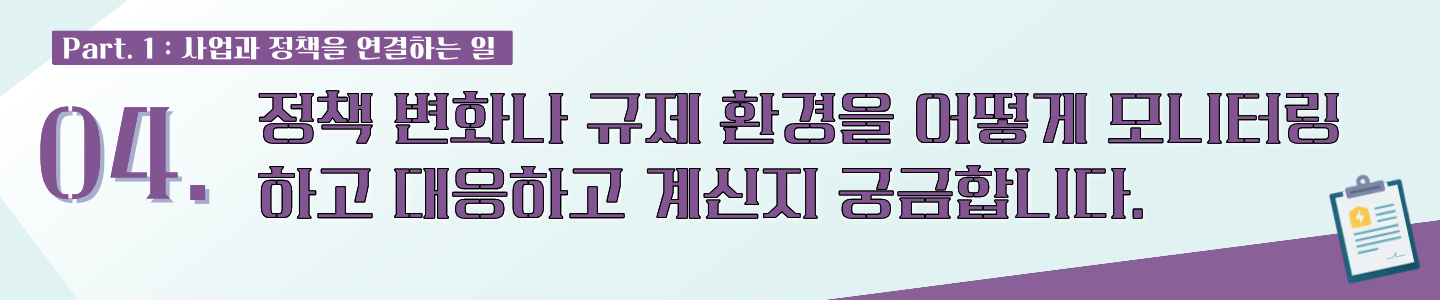 🎤김혜진 매니저님: 뉴스를 꾸준히 읽고, 특히 에너지 산업 관련 전문지를 접하는 습관이 도움이 됩니다. 이러한 정보 습득이 일상화될수록 정책과 산업의 흐름을 자연스럽게 이해할 수 있기 때문입니다.