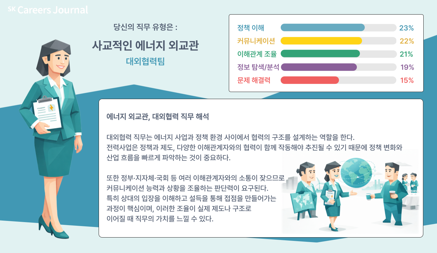 발전소를 짓거나 전력사업을 추진하기 위해서는 기술과 자본만으로 충분할까요? 실제로 그 이면에는 정책 환경을 이해하고, 다양한 기관과 협력하며 사업의 길을 여는 역할이 존재합니다. 마치 국가 간 관계를 조율하는 외교관처럼, 에너지 사업에서도 정책과 기관 사이를 연결하며 사업의 가능성을 만들어가는 사람들이 있습니다. 🤝