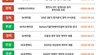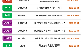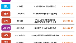 SK채용/채용 소식 썸네일형 리스트형 [2020 하반기 SK하이닉스 무.물.백.답] 사내비밀 빼고 다 털었습니다 [2020 하반기 SK하이닉스 무.물.백.답] 사내비밀 빼고 다 털었습니다 SK Careers Editor 2020 SK Careers Fair : SK하이닉스 무.물.백.답✍ SK하이닉스 지원자들 동작 그만! 채용담당자 손목 걸고(?) 입사 꿀팁 다 풀고 간 현장 공개👀 📕 SK하이닉스 채용안내 ■ 모집분야 : 신입 ■ 모집인원 : 000명 ■ 모집직무 : 1) 설계 2) 소자 3) 공정 R&D 4) 양산/기술 5) 양산/기술(Pakage&Test) 6) 양산관리 7) Product Engineering 8) System Engineering 9) 품질보증 10) Solution SW 11) Solution PE 12) IT 13) 마케팅/영업 14) 상품기획/기술인증 15) 경영지원 ✅ 2020 하반.. 더보기 [2020 하반기 SK(주) C&C 무.물.백.답] 채용 꿀팁 콕 찝어드립니다! [2020 하반기 SK(주) C&C 무.물.백.답] 채용 꿀팁 콕 찝어드립니다! SK Careers Editor 2020 SK Careers Fair : SK주식회사 C&C 무.물.백.답✍ SK주식회사 C&C 채용 꿀팁, 본격 스포일러! 사이다 백만개👏 궁금증 시~원하게 풀고 가세요 📕 SK주식회사 C&C 채용안내 ■ 모집분야 : 신입 ■ 모집인원 : 00명 ■ 모집직무 : 1) Software Engineering 2) Data Analytics/Engineering 3) Cloud/Infra Engineering ✅ 2020 하반기 SK 신입 채용 안내 - 접수기간 : 2020년 9월 14일(월) ~ 9월 25일(금) 24:00 - 모집회사 : 총 6개사 / SK주식회사 C&C, SK이노베이션, SK.. 더보기 2020 하반기 SK 신입 채용 2020 하반기 SK 신입 채용 2020년 9월 14일, 월요일부터 2020 하반기 SK 신입 채용을 시작합니다. SK 구성원이 되고 싶으신 분들이라면 이번 기회를 꼭 잡으세요! 서류 접수 마감은 9월 25일 금요일, 자정까지입니다. 자세한 일정은 아래 포스터에서 확인 부탁드립니다.SK Careers Editor 관계사별 직무별 확인하기어떤 직무에서 어떤 업무를 하는지 감이 잘 안오신다고요? 지원을 희망하는 관계사, 분야, 직무에 따라 필요한 내용들을 정리해 두었습니다. 자세한 정보는 아래 표를 참조해주세요. 더 자세히 알고싶으시다면, SKCE의 기사들을 확인해 보세요~! 직무별 알찬 정보들이 가득 담겨 있답니다. SK Careers Fair 일정 확인하기'SK Careers Fair'는 누구에게 열려있.. 더보기 SK텔링크 2020년도 하반기 신입사원 모집 SK텔링크 2020년도 하반기 신입사원 모집 더보기 SK그룹 채용 9월 2주차 SK이노베이션 배터리! 도대체 무엇에 쓰이는 물건인고? 더보기 SK그룹 채용 9월 1주차 SK이노베이션 배터리! 도대체 무엇에 쓰이는 물건인고? 더보기 SK그룹 8월 4주차 채용 소식 SK케미칼 직무 인터뷰: MA의 직무의 모든 것 SK이노베이션 배터리! 도대체 무엇에 쓰이는 물건인고? 더보기 SK그룹 8월 3주차 채용 소식 SK케미칼 직무 인터뷰: MA의 직무의 모든 것SK건설 국내 최초로 OO을 만들다 더보기 이전 1 ··· 33 34 35 36 37 38 39 ··· 82 다음