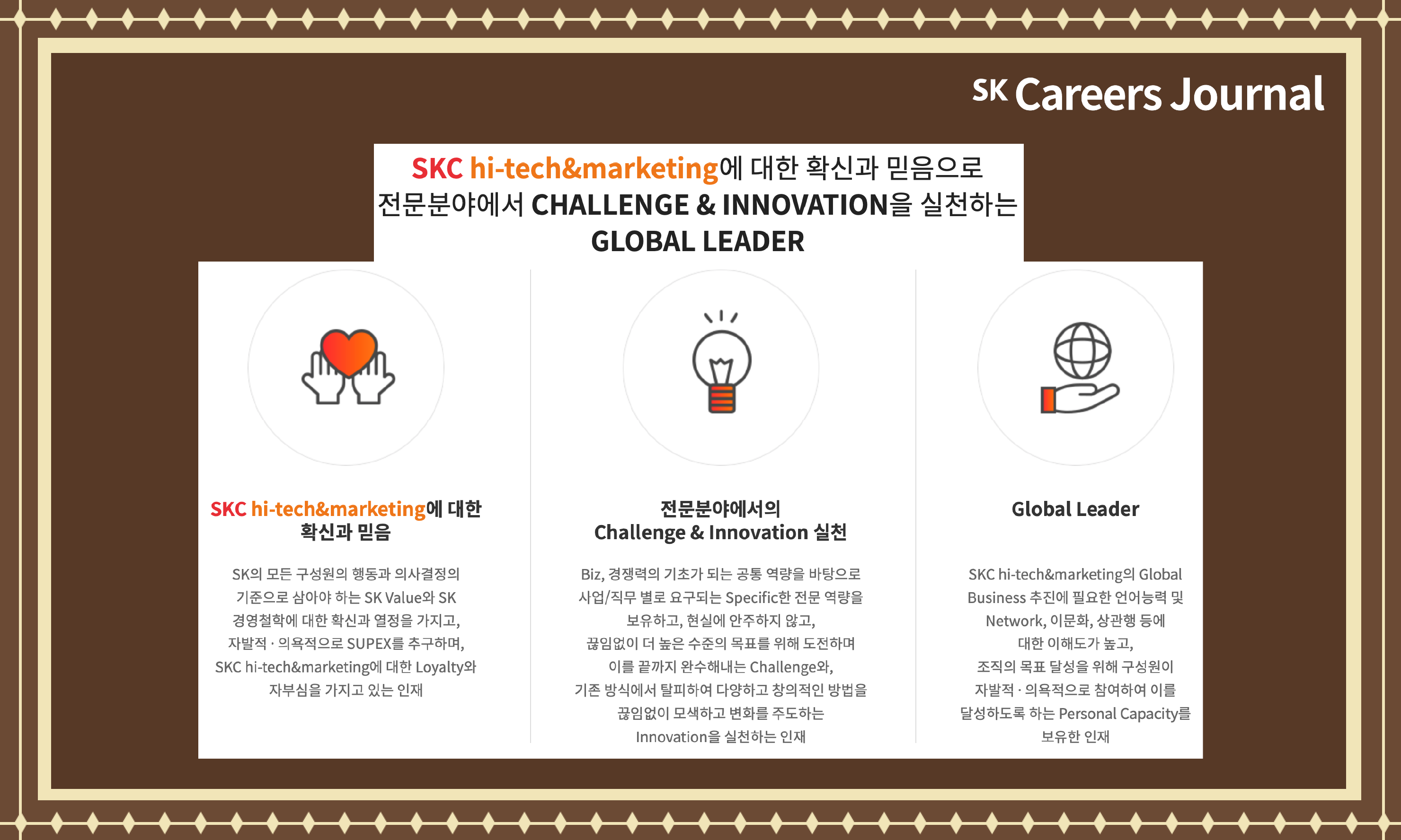 SKC의 인재상 첫 번째는 SKC hi-tech&marketing에 대한 확신과 믿음을 지닌 사람입니다. SKC hi-tech&marketing은 오랜 역사 속에서 최고, 최초의 제품을 만들어왔고 경험과 지식, 노하우를 바탕으로 신사업을 추진할 수 있는 잠재력과 역량도 충분한 회사입니다. 이러한 부분에 대한 확신과 믿음을 가지고 함께 성장감을 느끼며 나아가고자 하는 미래지향적인 인재를 환영합니다.