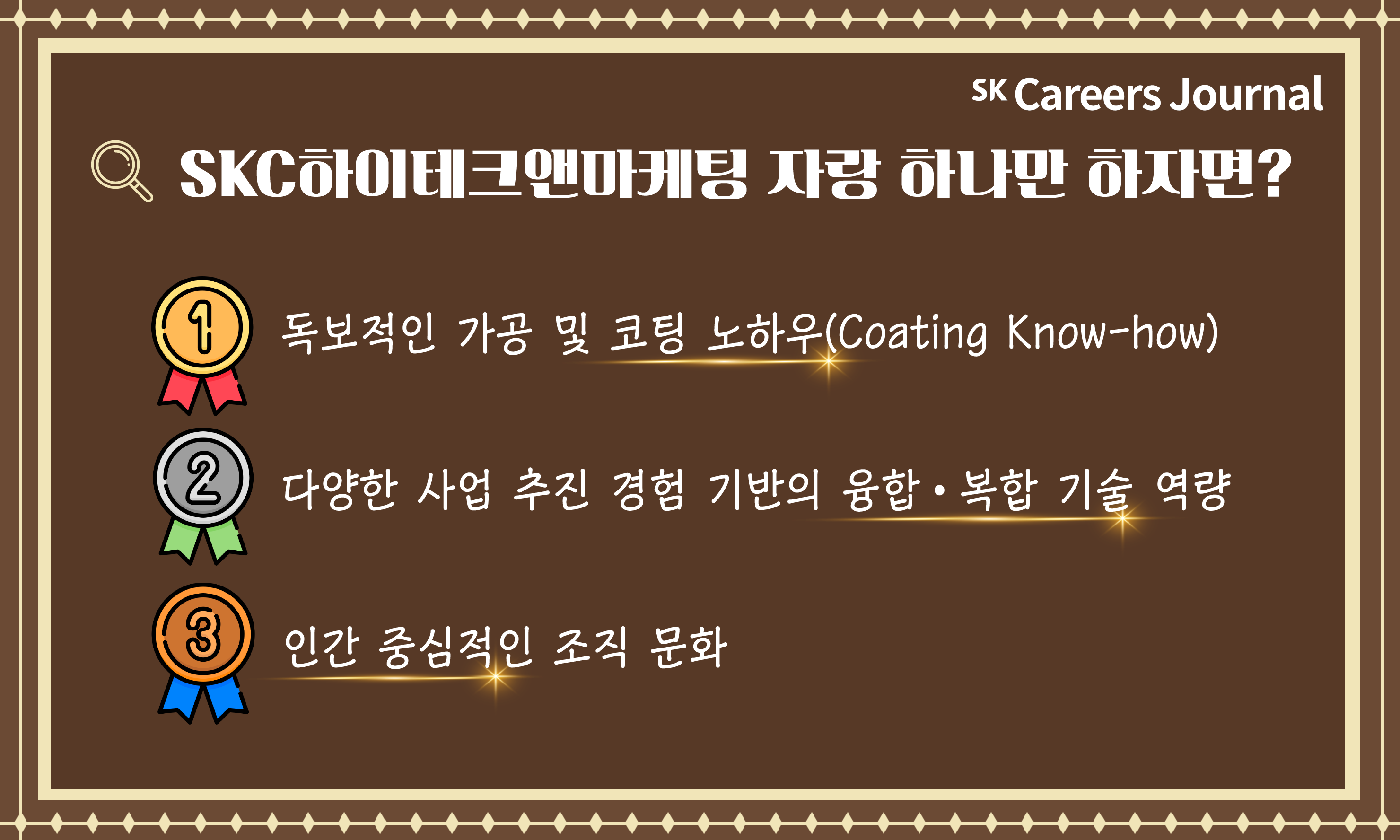 우선 SKC HT&M은 40년이 넘는 기간 동안 축적시켜 온 독보적인 가공 및 코팅 노하우(Coating Know-how)가 있습니다. 시장 점유율 1위에 빛나는 것과 마찬가지로, 더 많은 기술과 개발을 발전시키는데 밑거름이 되는 기술입니다.