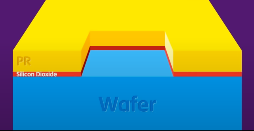 포토 공정은 위 그림에서 보실 수 있듯이, ‘PR 도포 – 노광 – 현상’ 이렇게 3단계로 진행됩니다. PR(Photo Resist)라는 물질을 산화막 위에 도포함으로써, 빛을 받으면 성질을 이용하여 회로를 새기게 됩니다. 이후 남기고자 하는 패턴만을 남긴 마스크를 PR 위에 덧댄 후, 빛을 노광하게 됩니다. 노광된 빛은 ‘현상’을 통해 필요없는 PR을 제거하여 필요한 패턴의 PR만 남기는 과정을 거치게 됩니다.