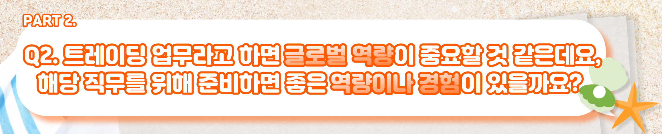 무역 관련 자격증이나 제2외국어 점수도 없고요. 물론 영어를 잘하시는 건 아주 큰 도움이 됩니다. 주요한 업무는 대부분 영어로 이루어진다고 보아도 무방하니까요.